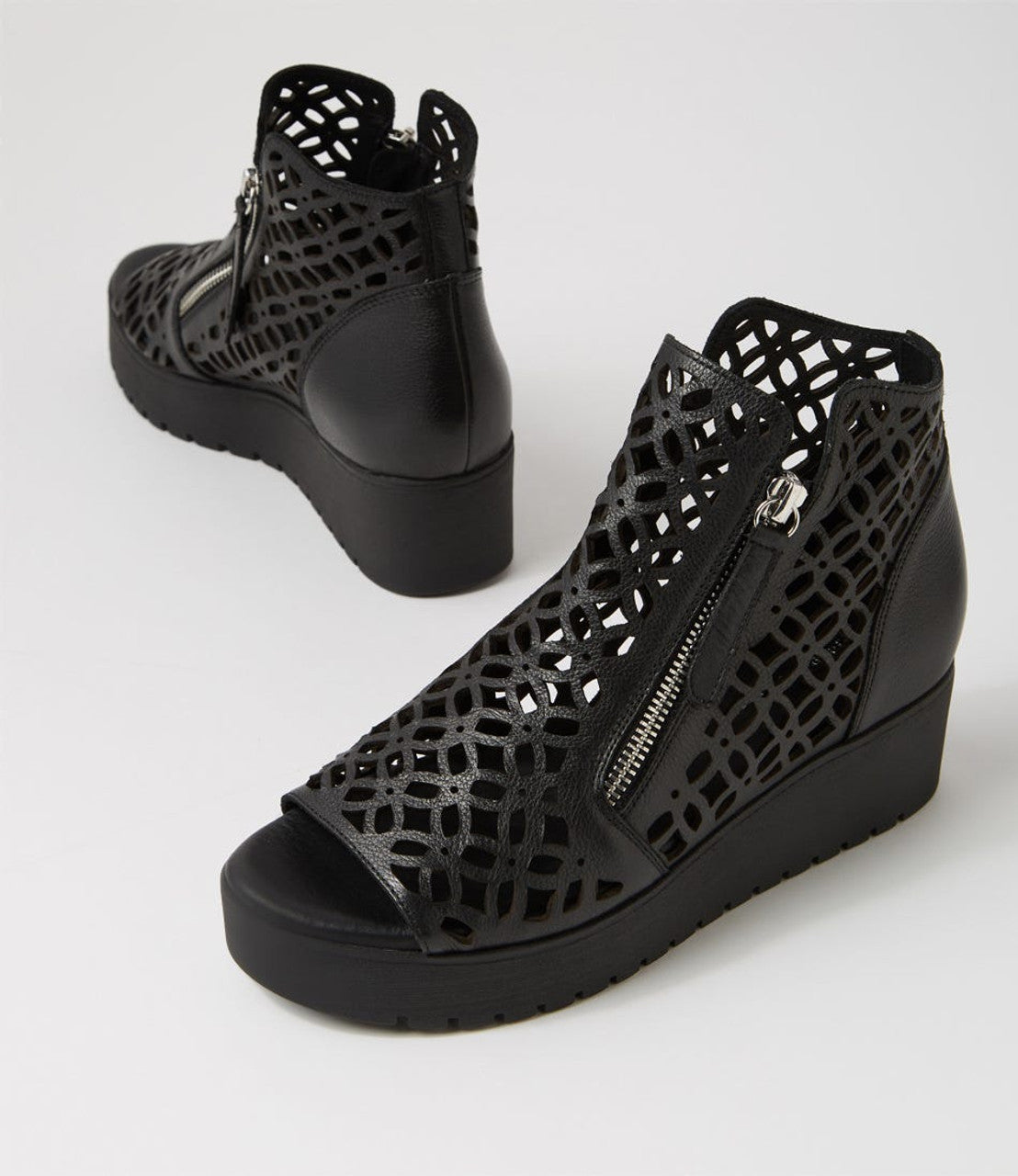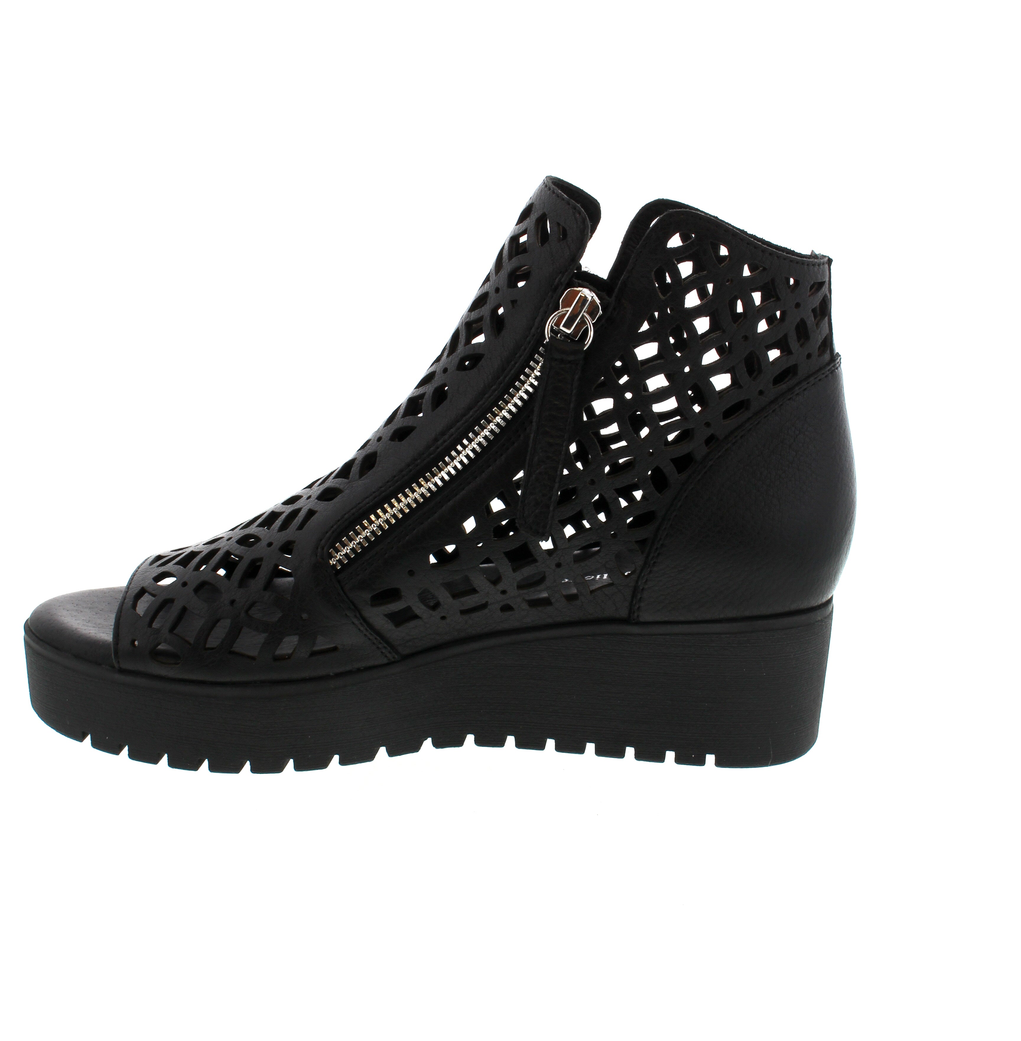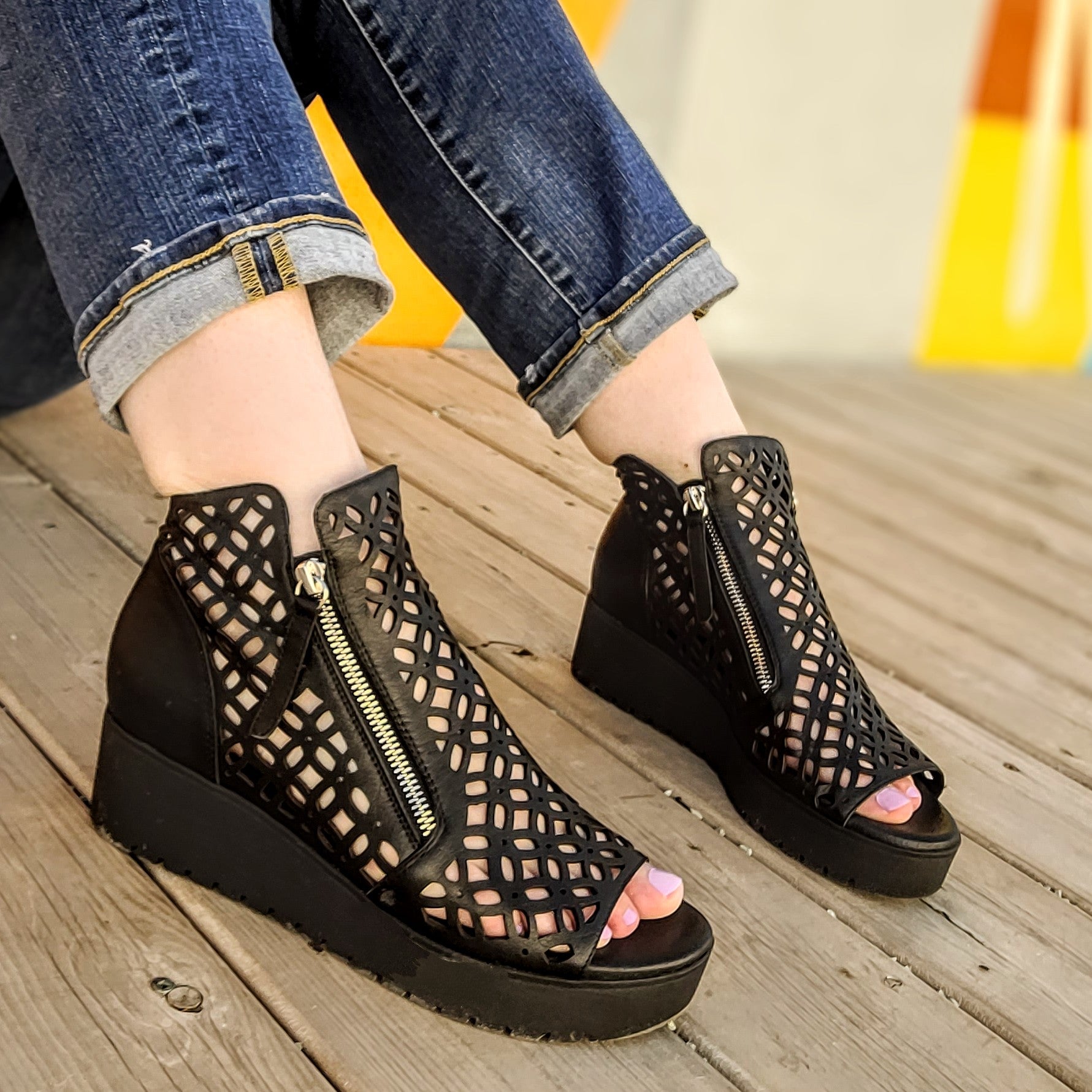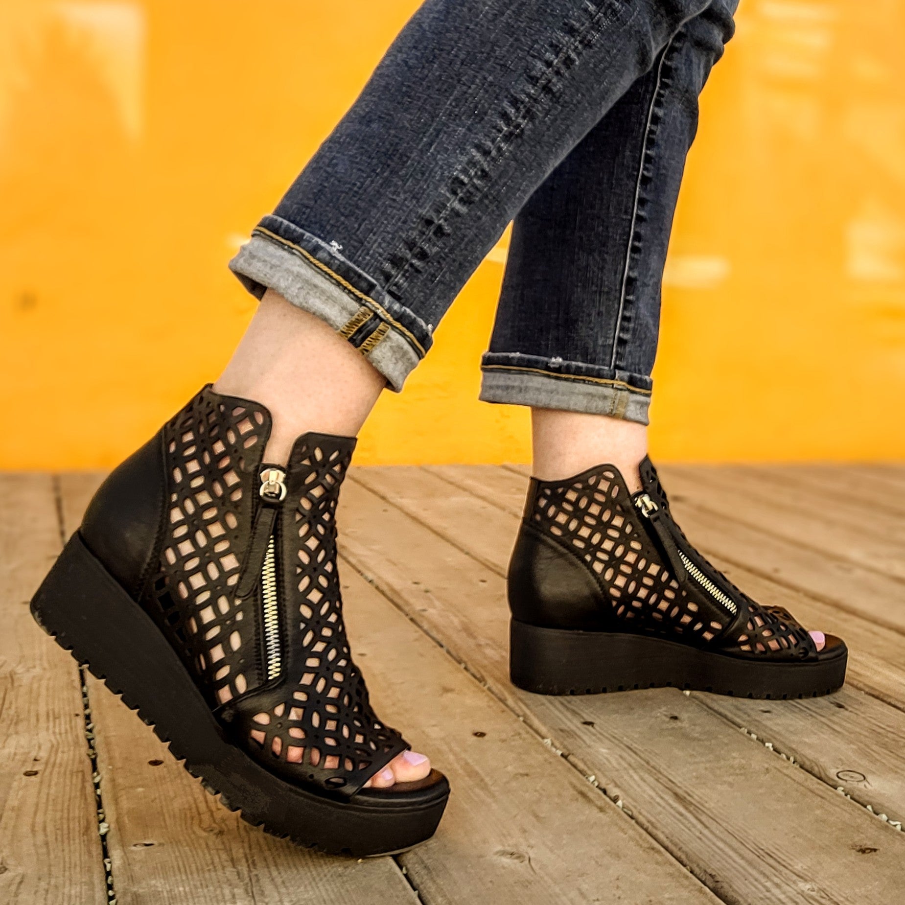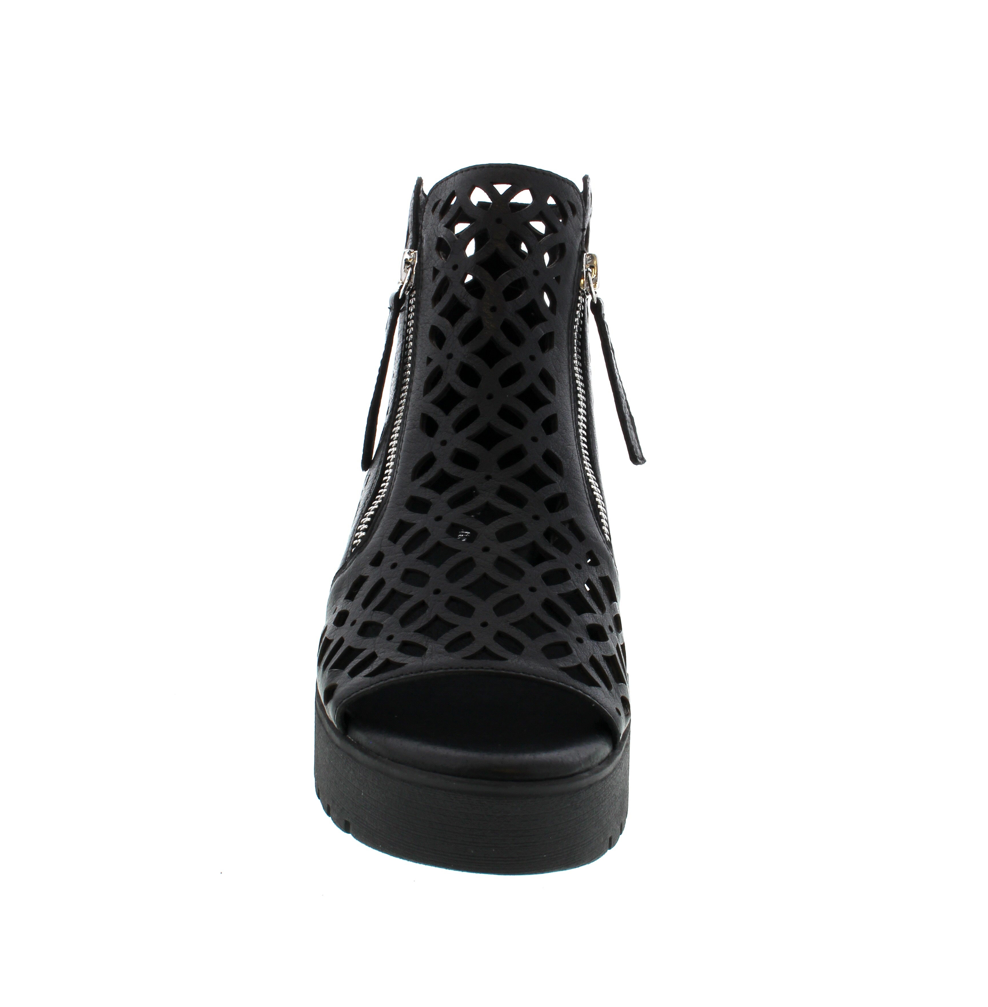 The Django & Juliette Olizzi wedge bootie sandal offers a sophisticated option for evenings out or a day of shopping. Crafted with a perforated leather upper and convenient side zipper, these shoes effortlessly blend practicality and fashion.