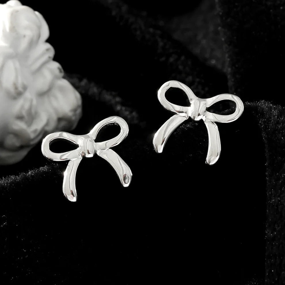 Elevate your style with our Hackney Nine Bow - White Gold earrings. Made from premium white gold, their polished silver-toned finish adds a touch of refined brilliance to any outfit. The delicate ribbon bow design symbolizes timeless elegance, while the lightweight and secure butterfly back makes them perfect for everyday wear.