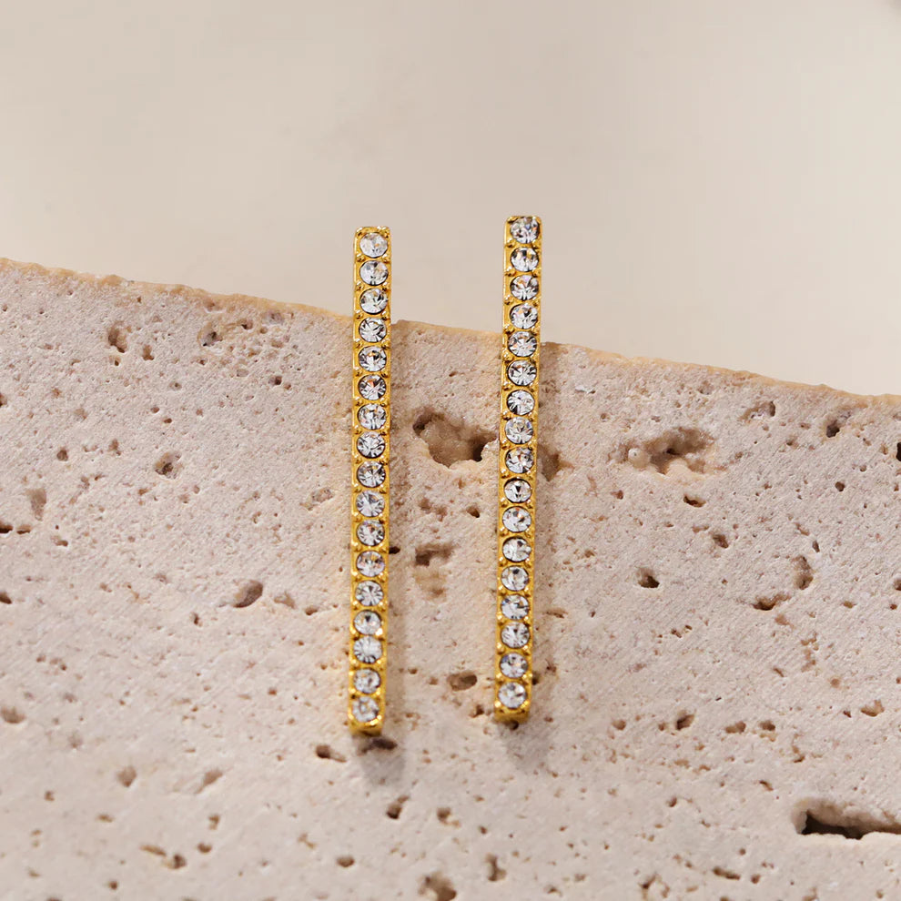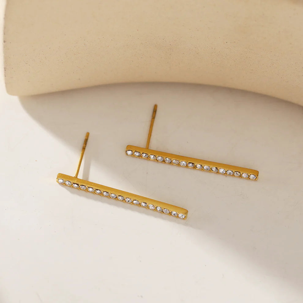 Elegant stud earrings featuring sparkling zirconia gemstones in a pavé bar design. The minimalist style offers timeless appeal with understated sophistication, making these versatile studs perfect for everyday wear or special occasions. AAA-grade zirconia provides brilliant sparkle and lasting beauty. Crafted from Hand Forged Graded Metal Layered in Pure 18 Karat Gold. Free of Nickle, Lead and Cadmium. Non-Allergic and will not turn Skin Green.