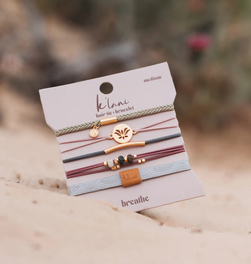 The K'lani Breathe set features five versatile bracelets that also serve as hair ties, designed in calming colors to inspire mindfulness and tranquility. Each piece is adorned with a lotus flower charm and earthy stone beads, offering subtle, yoga-inspired accents that promote a sense of peace and balance throughout your day. Ideal for those seeking both style and serenity in their accessories.