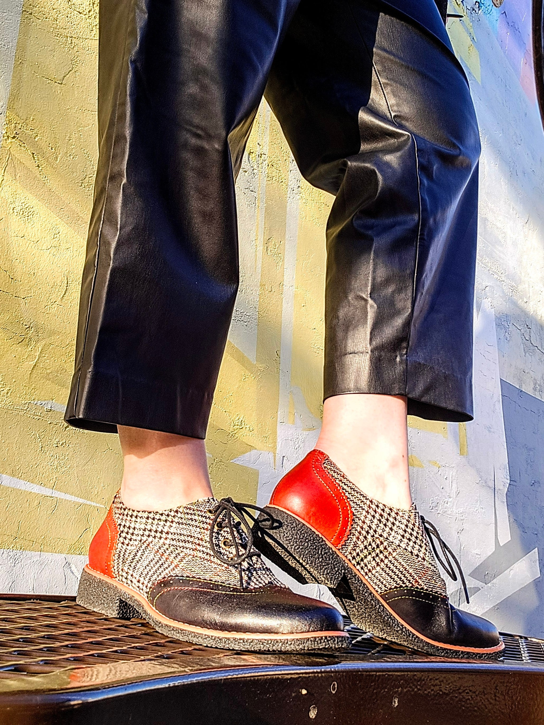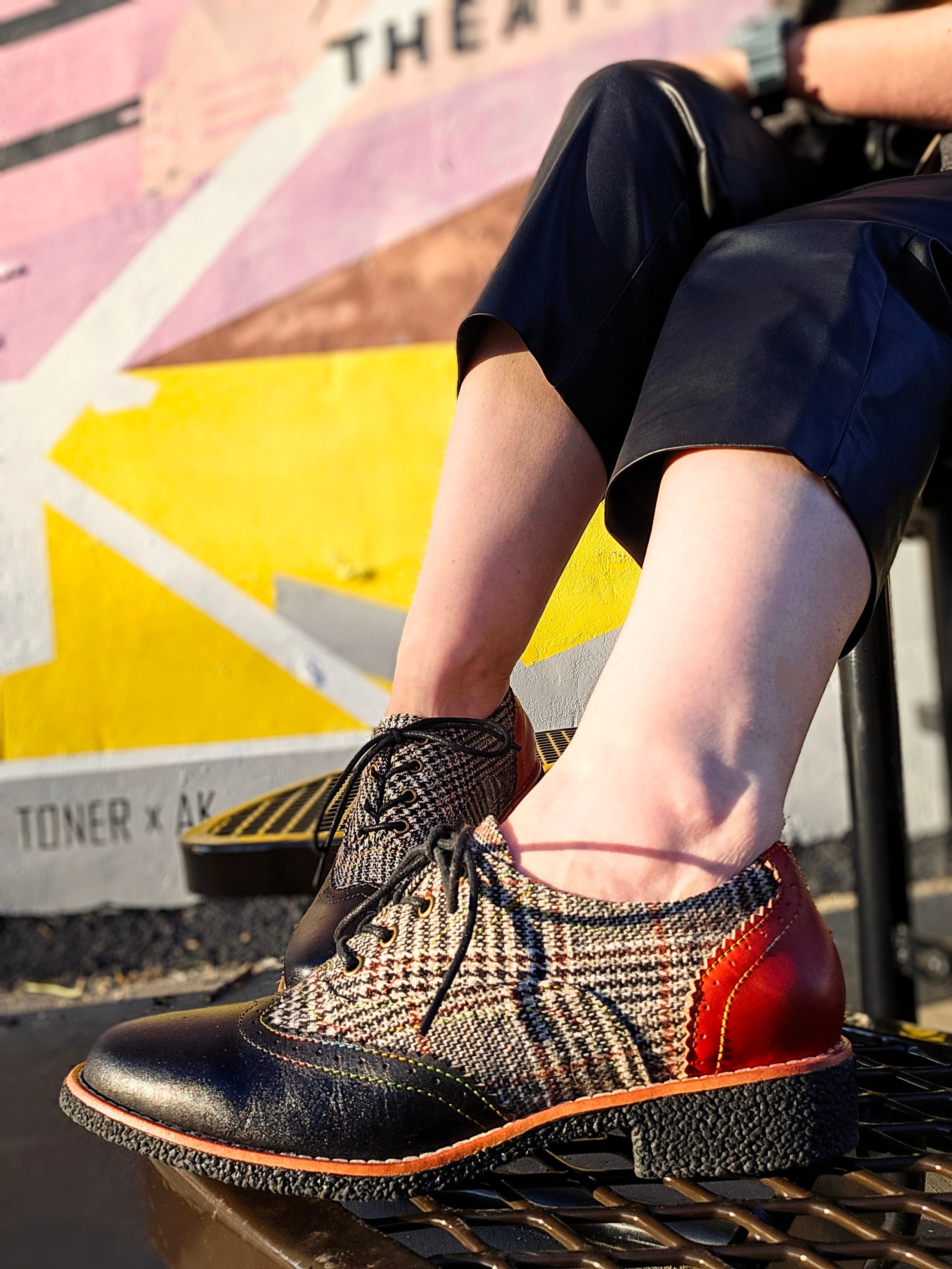 Upgrade your wardrobe with the L'Artist Muggiasti. This traditional style brogue boasts a wax cotton lace and two-tone plaid wool blend for a unique touch. The burnished and polished leather adds sophistication, while the rubber crepe sole and natural stitched welt ensure durability. Perfect for any formal occasion.