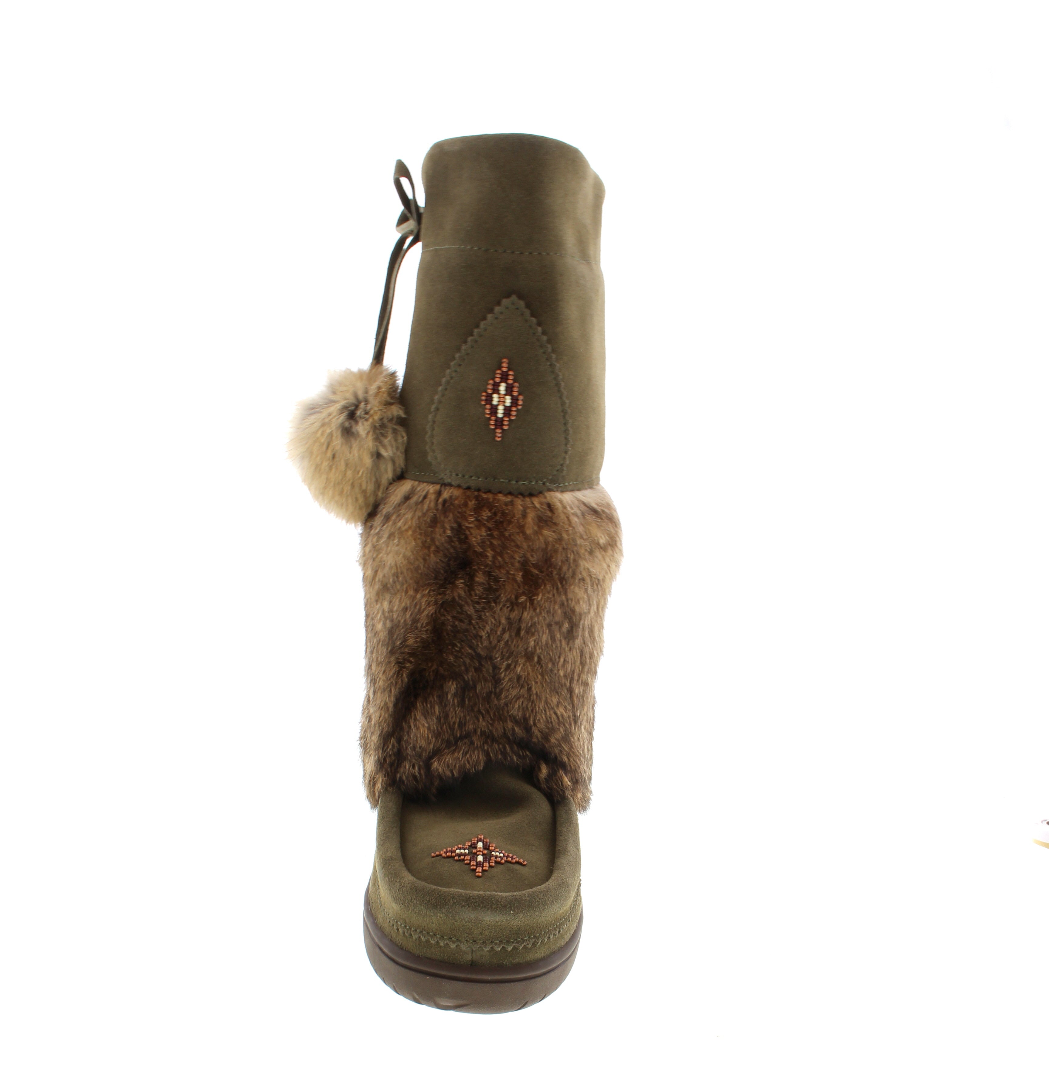 The Manitobah Snowy Owl mukluks in Dark Olive are expertly crafted mid-calf footwear featuring a soft suede upper paired with detailed beading that reflects Indigenous artistry. These insulated boots include a cozy faux fur collar for added warmth and comfort, designed to protect against harsh winter conditions. Combining traditional design with modern insulation, they provide both style and reliable cold-weather performance for those valuing quality and cultural heritage in their footwear.