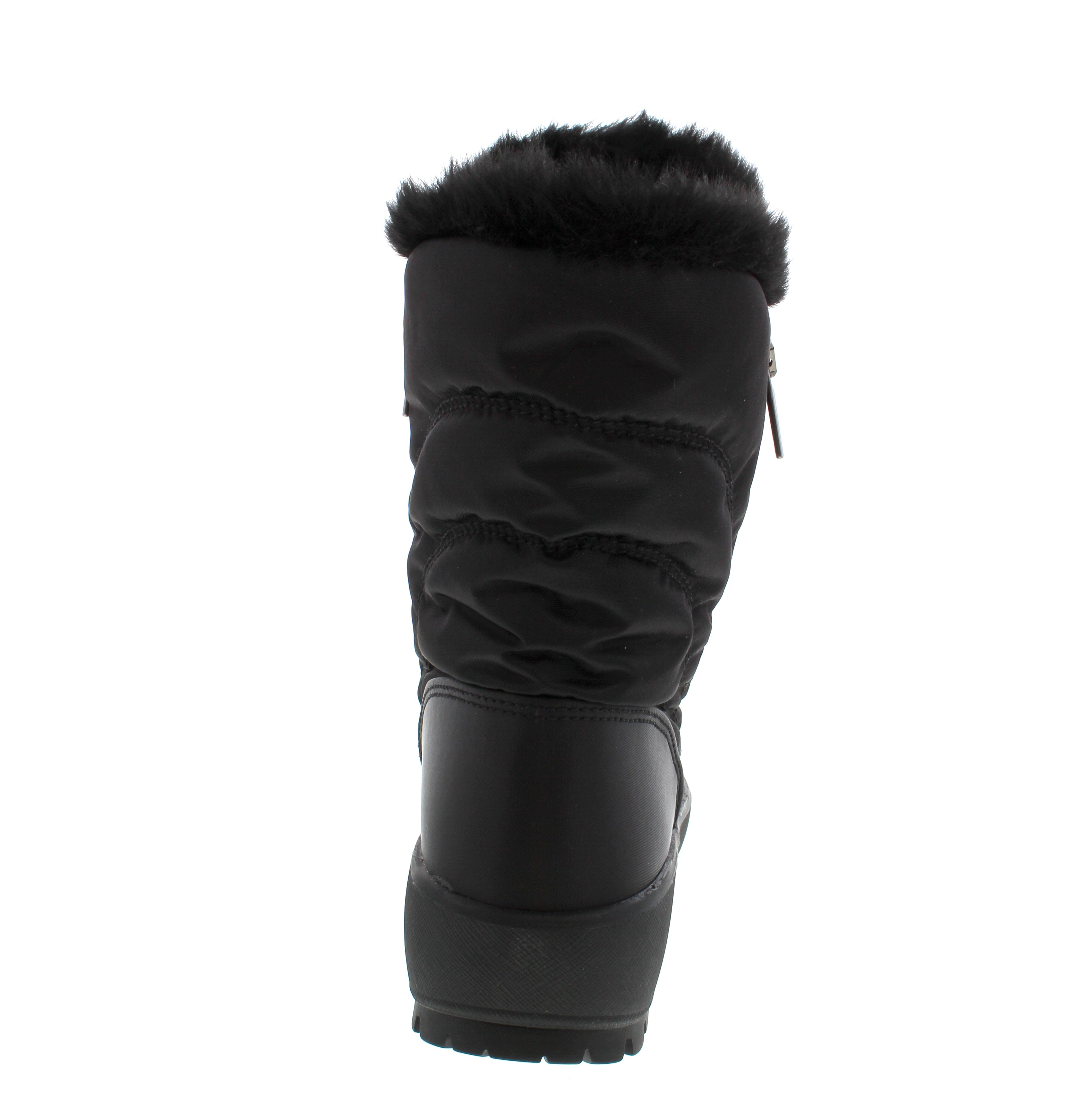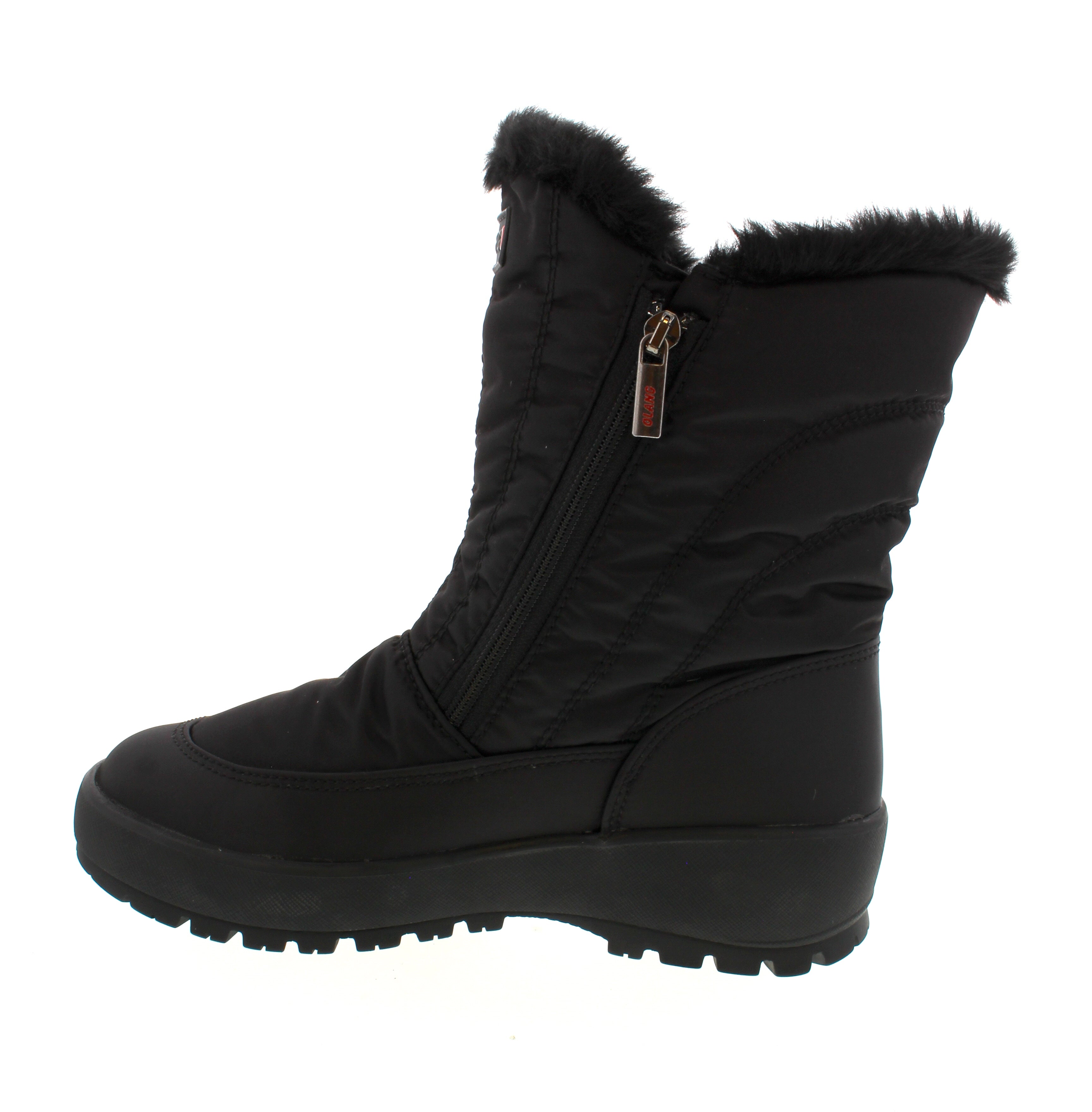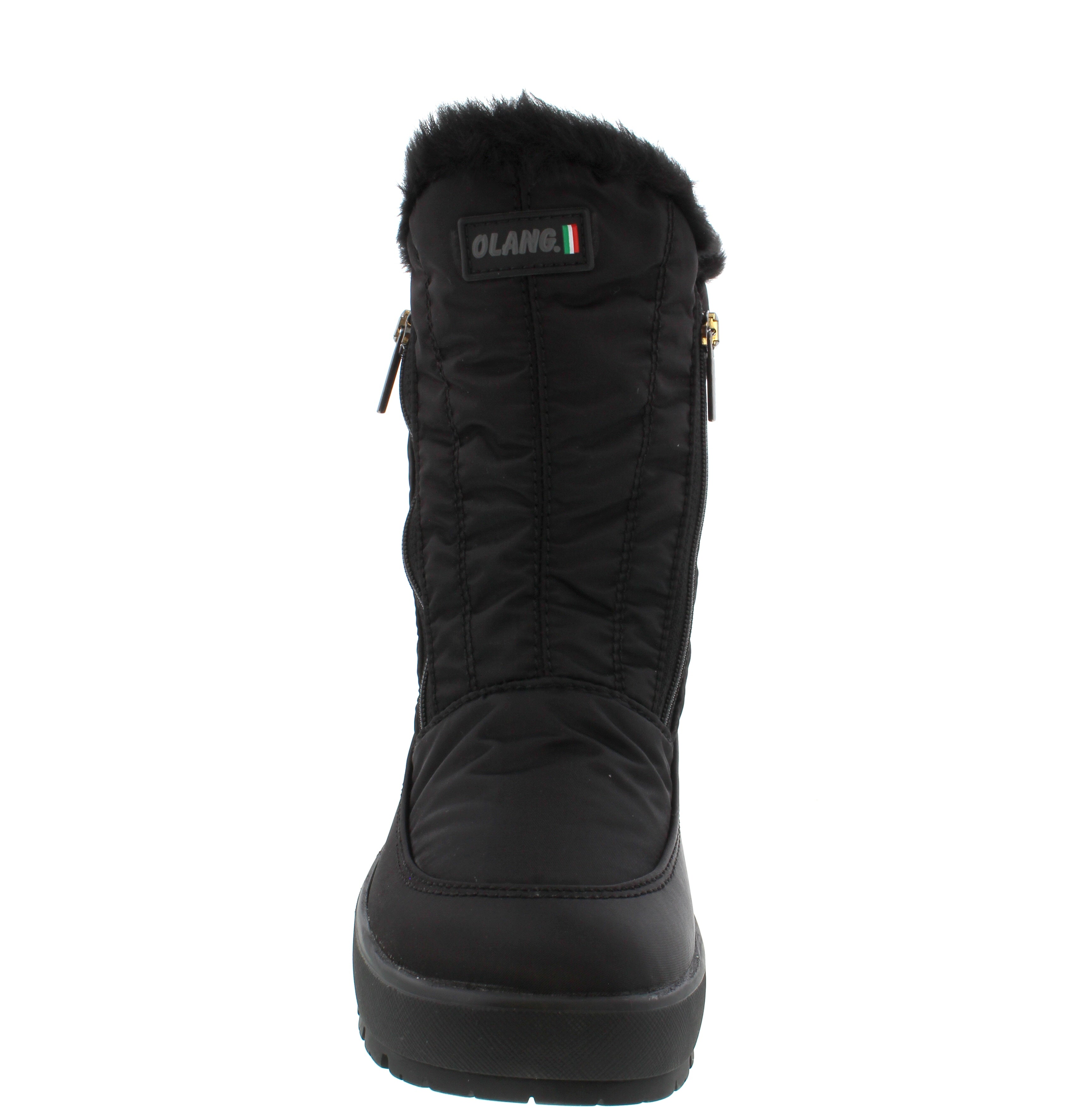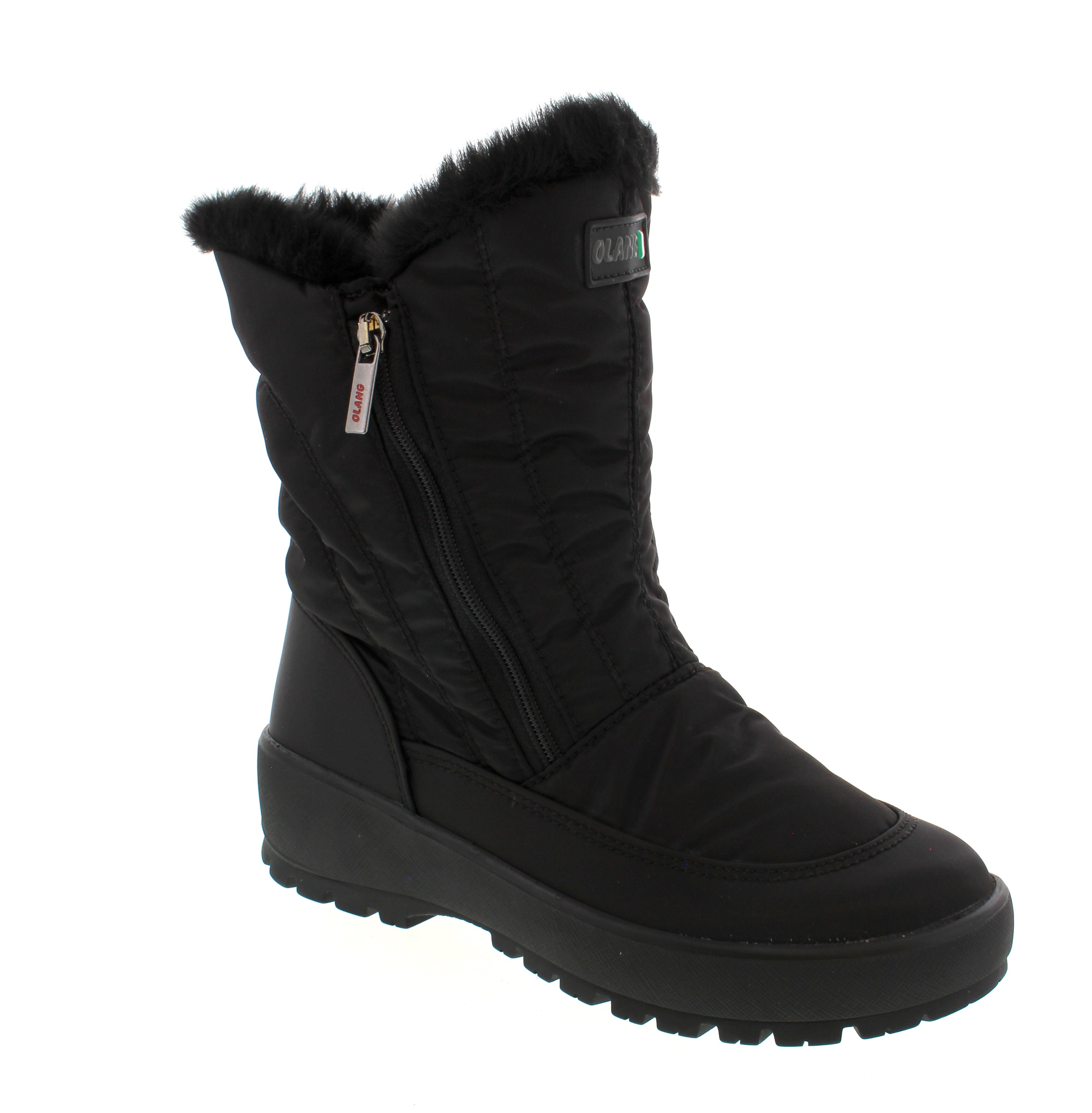 The Olang Monica boot in black combines durable nylon waterproof upper with a cozy faux fur collar for warmth and comfort. Insulated for cold weather, it features an ice slip-resistant traction outsole to enhance stability on slippery surfaces. Designed with convenience in mind, the double side zip entry allows easy on and off. Orthotic-friendly construction ensures support and compatibility for customized insoles, making this boot a reliable choice for winter conditions.