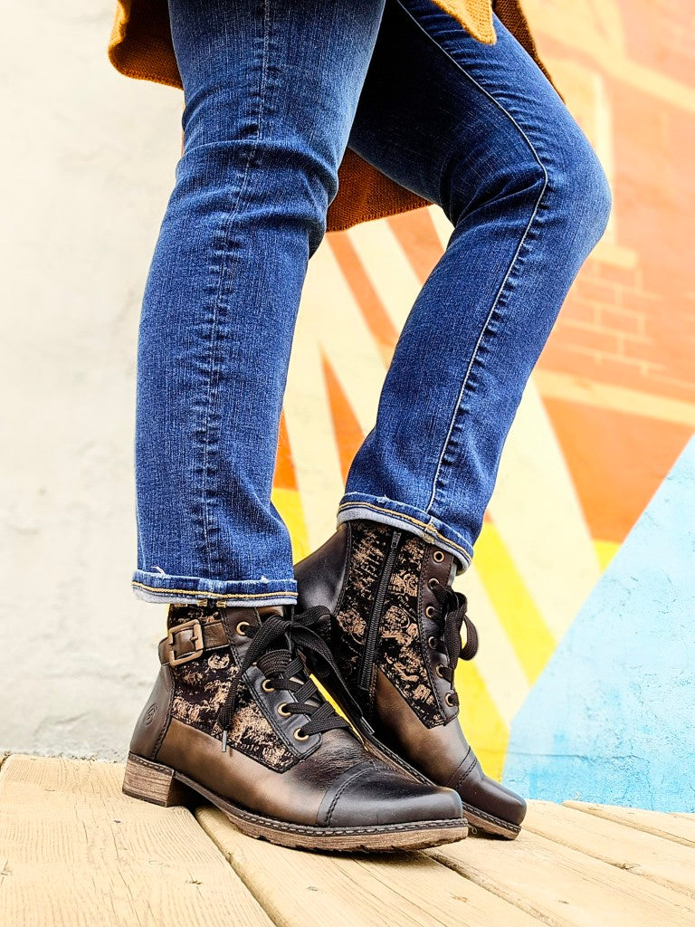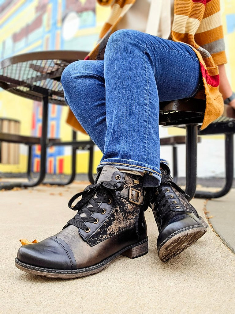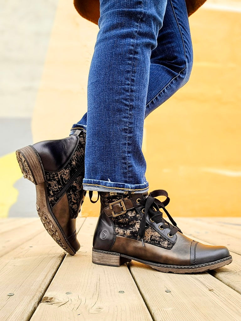 The Remonte D4380-03 ankle boot features a removable insole for ultimate comfort. With a convenient side zipper, elegant artistic design and buckle details, this boot is perfect for long-lasting wear and easy on and off.