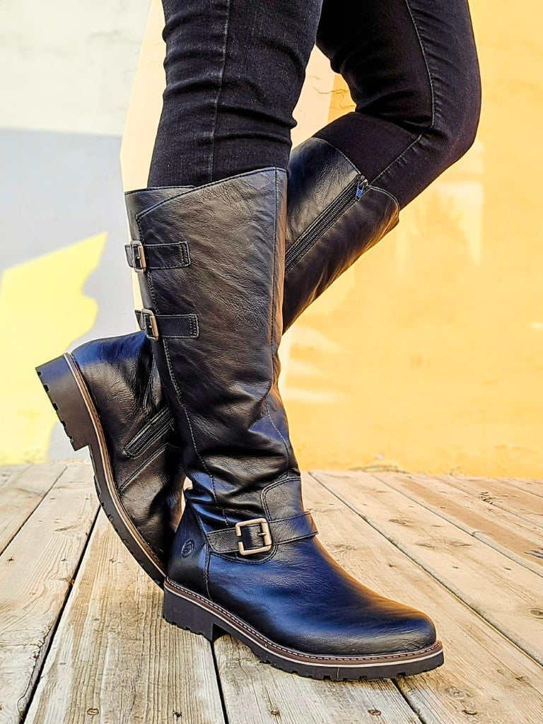 The Remonte R6590-01 knee-high boot features a leather upper, side zipper for easy on/off, decorative buckles and a gripped sole for traction.