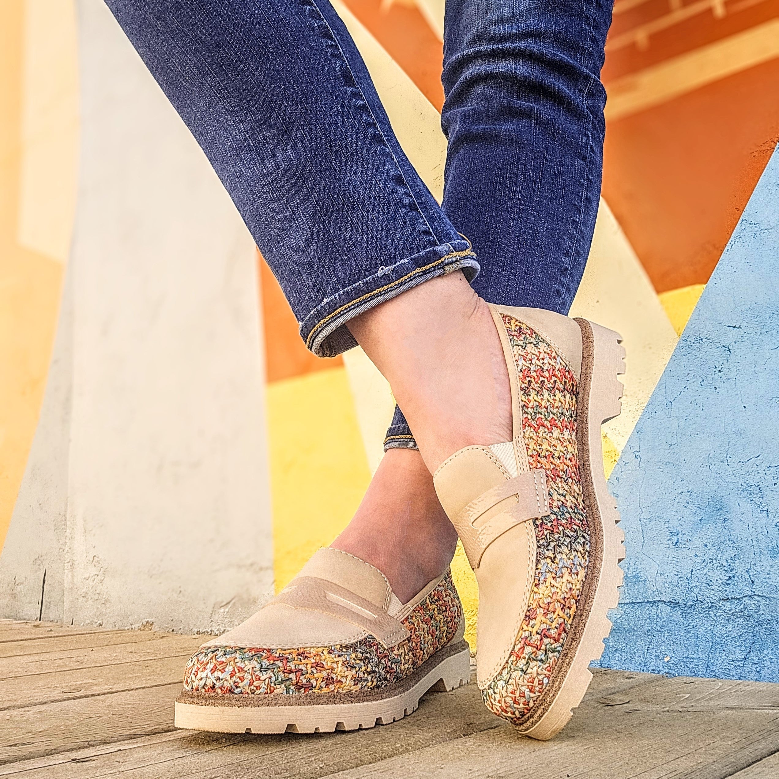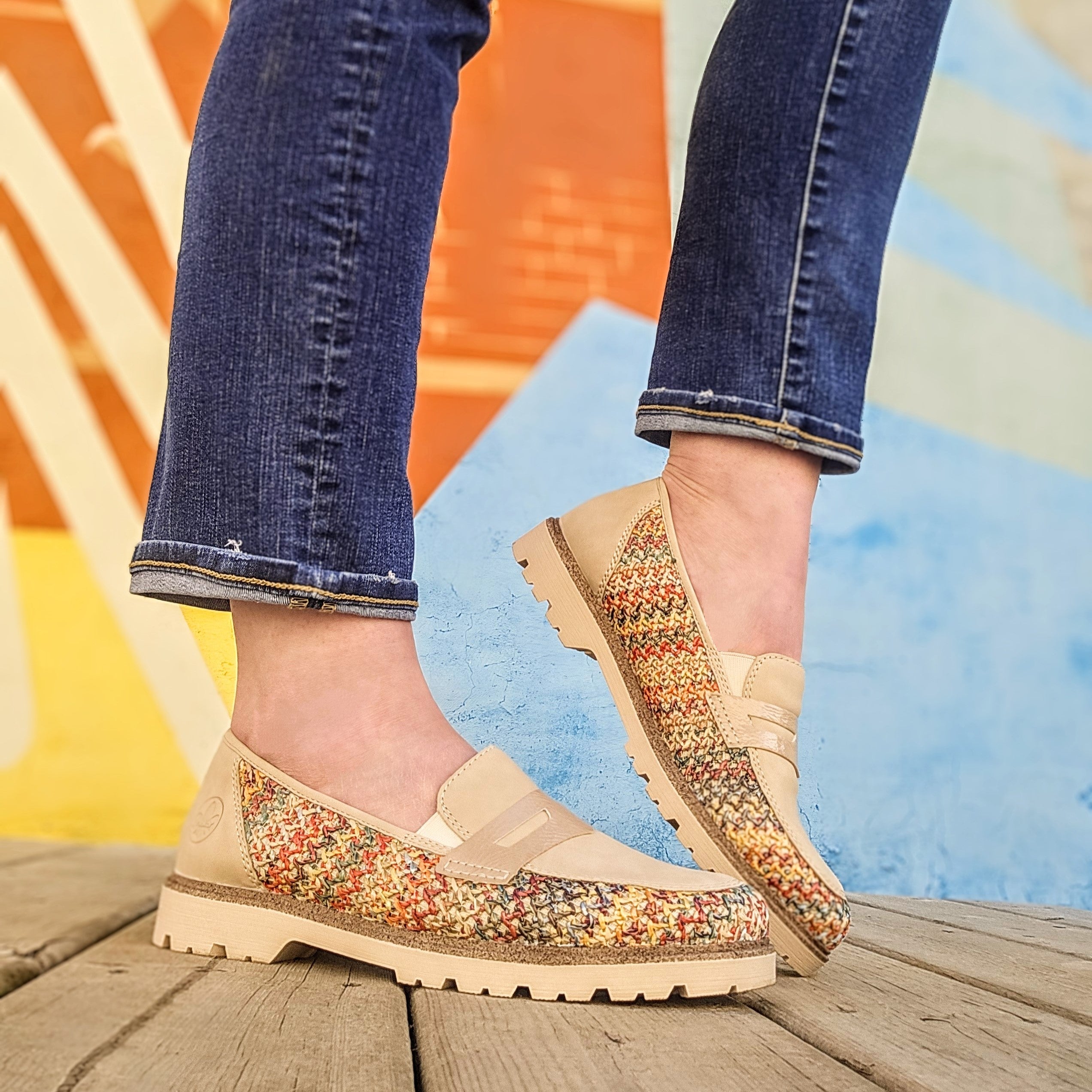 Experience the stunning colors of the multi-colored Rieker 45562-90 loafers! With comfort, functionality, and style all in one pair, these shoes will exceed your expectations. The elastic band makes them effortless to put on and take off, while the light and grippy sole ensures all-day comfort. The extra soft cover sole adds to the overall feeling of well-being. Don't miss out on these amazing shoes!