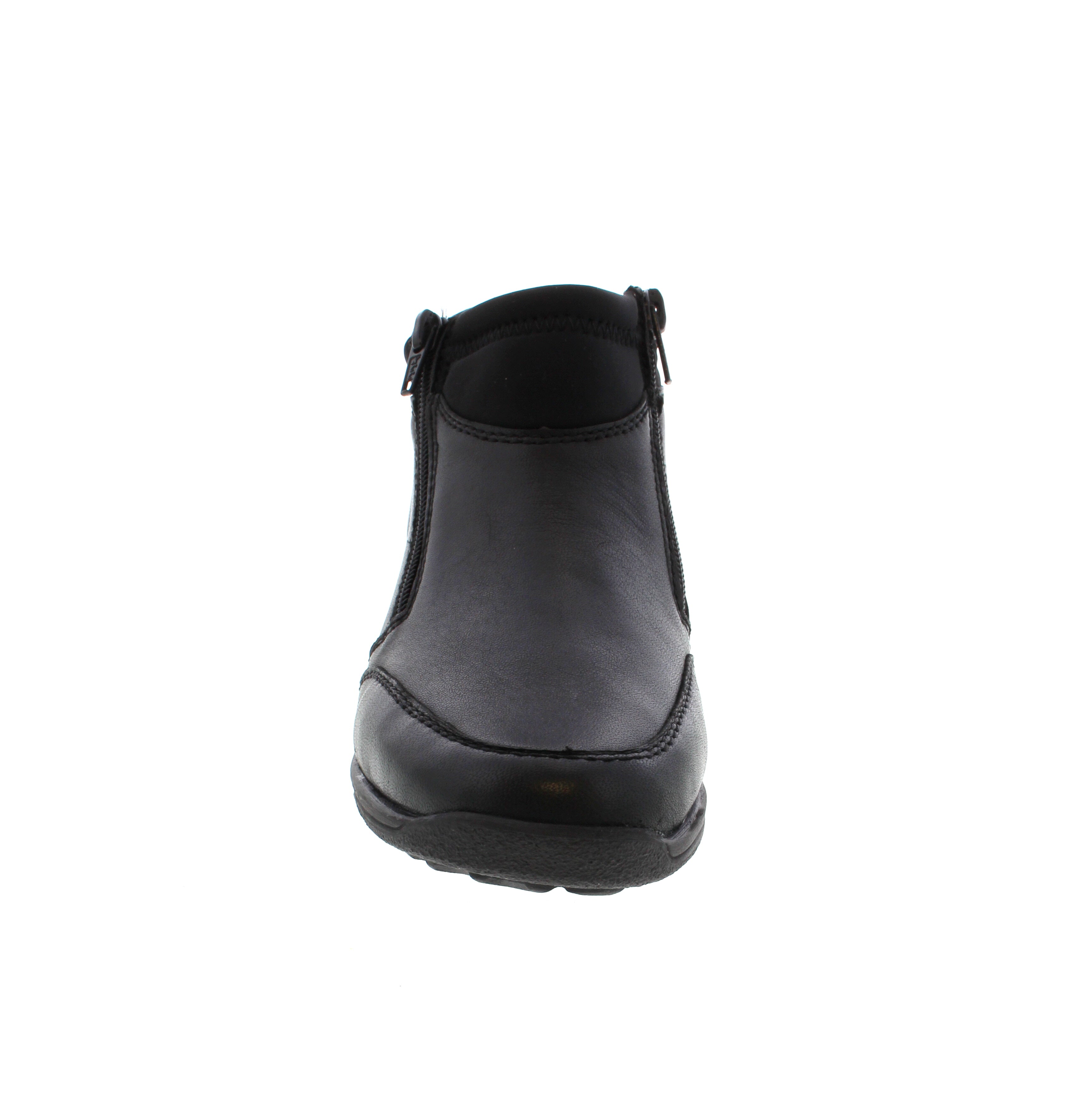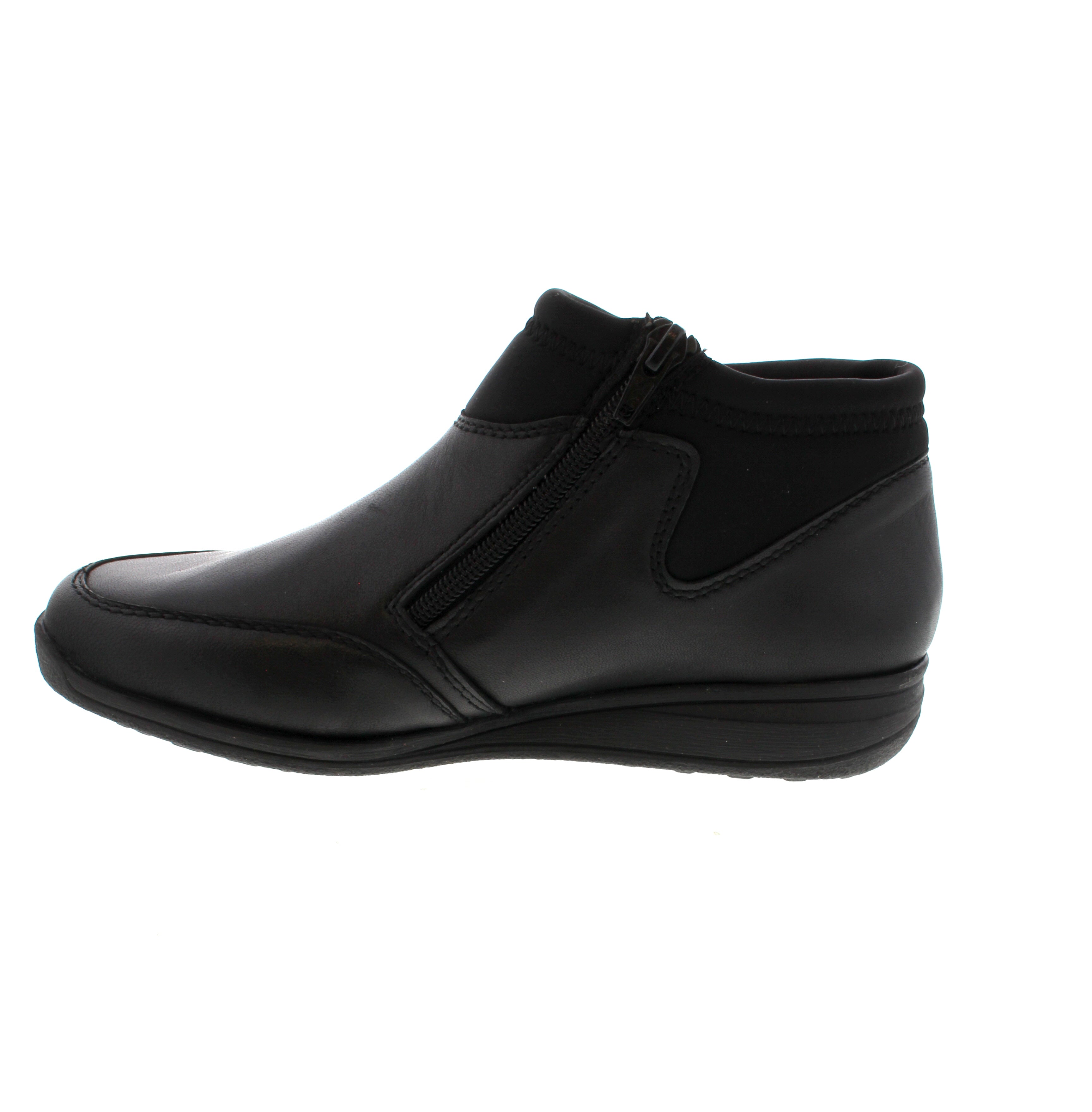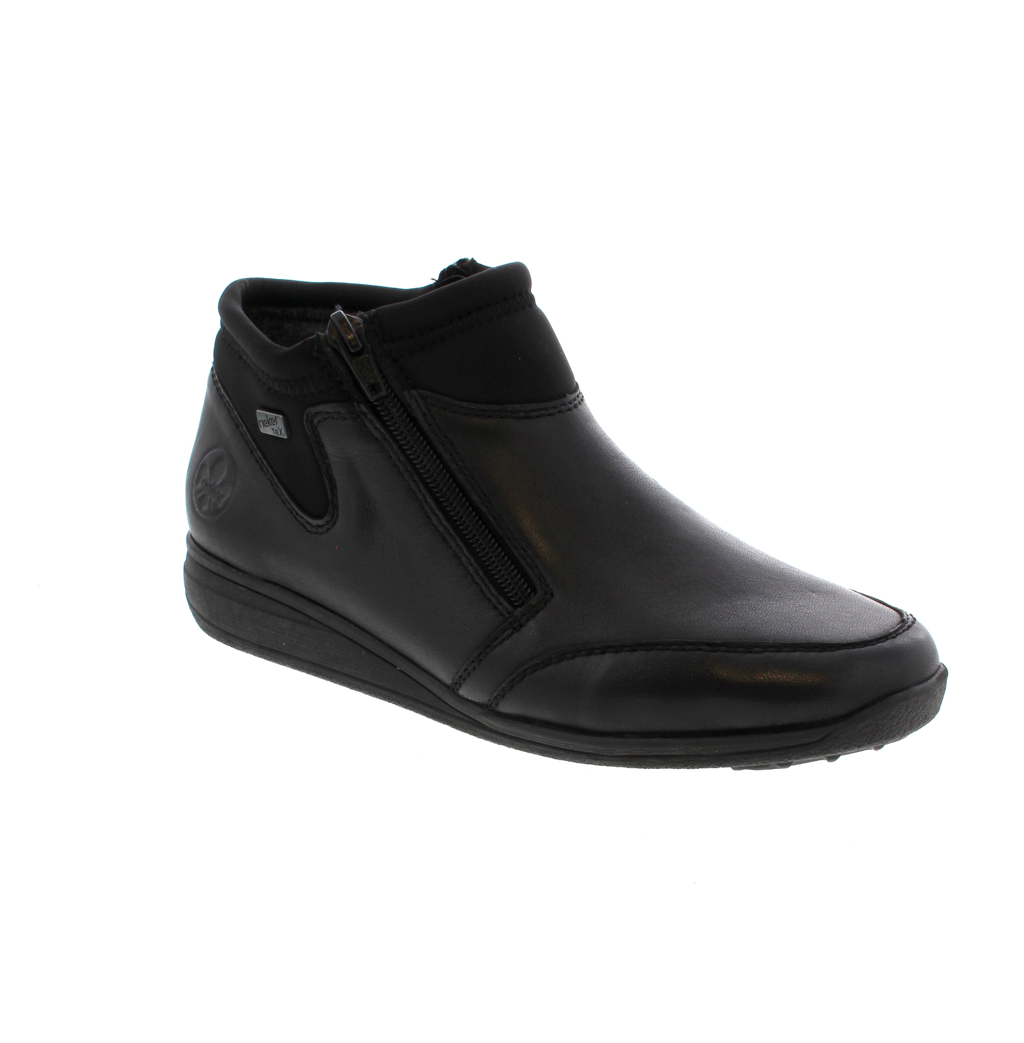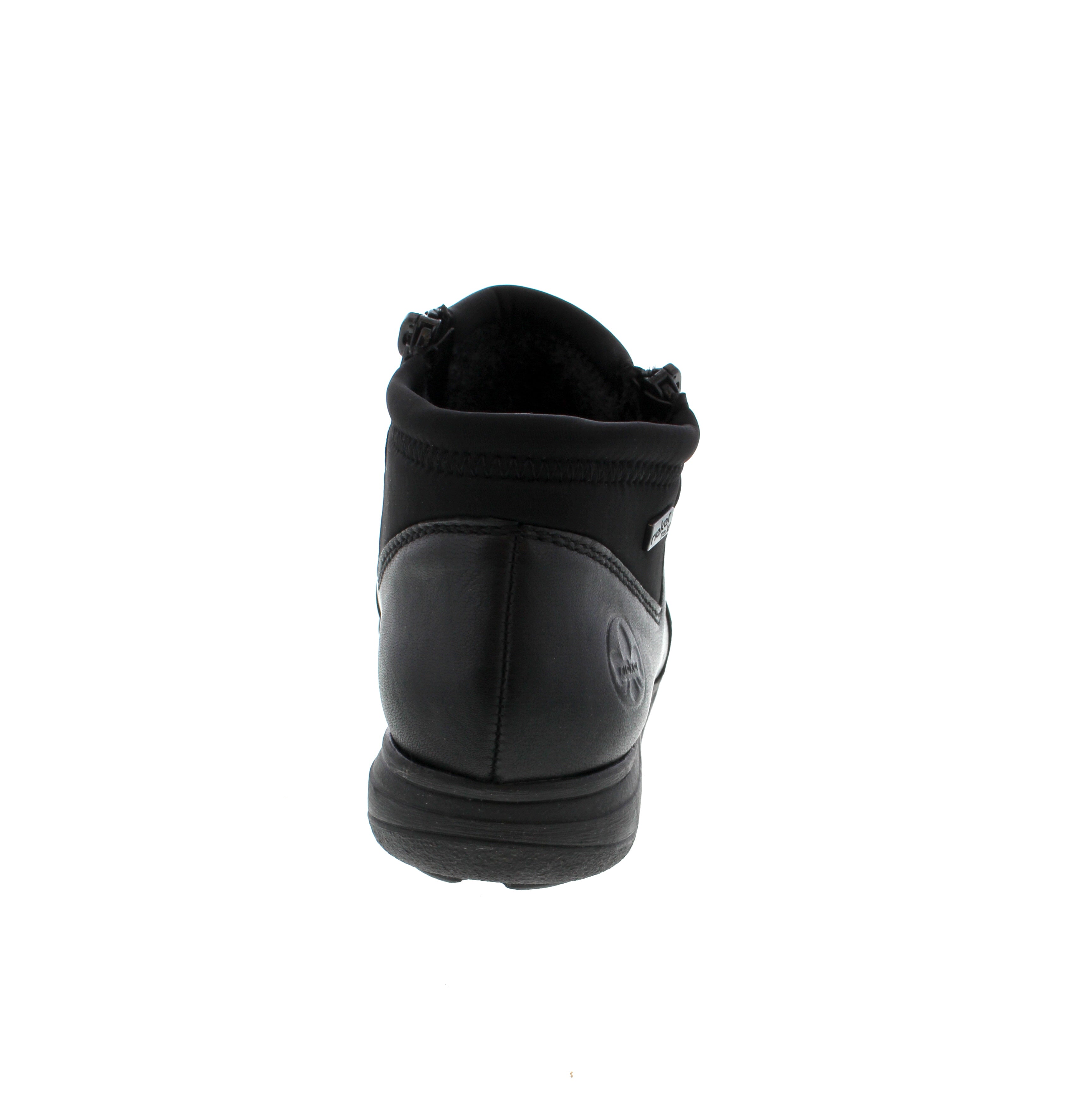 These elegant black Rieker ankle boots combine style and practicality effortlessly. Crafted from smooth leather, they feature a convenient zippers for quick wear and a grippy sole that ensures steady footing. The padded, removable insole provides lasting comfort, while the extra width offers a roomy fit. With the RiekerTEX membrane, your feet stay protected from wind and moisture, making these boots a reliable choice for any occasion.