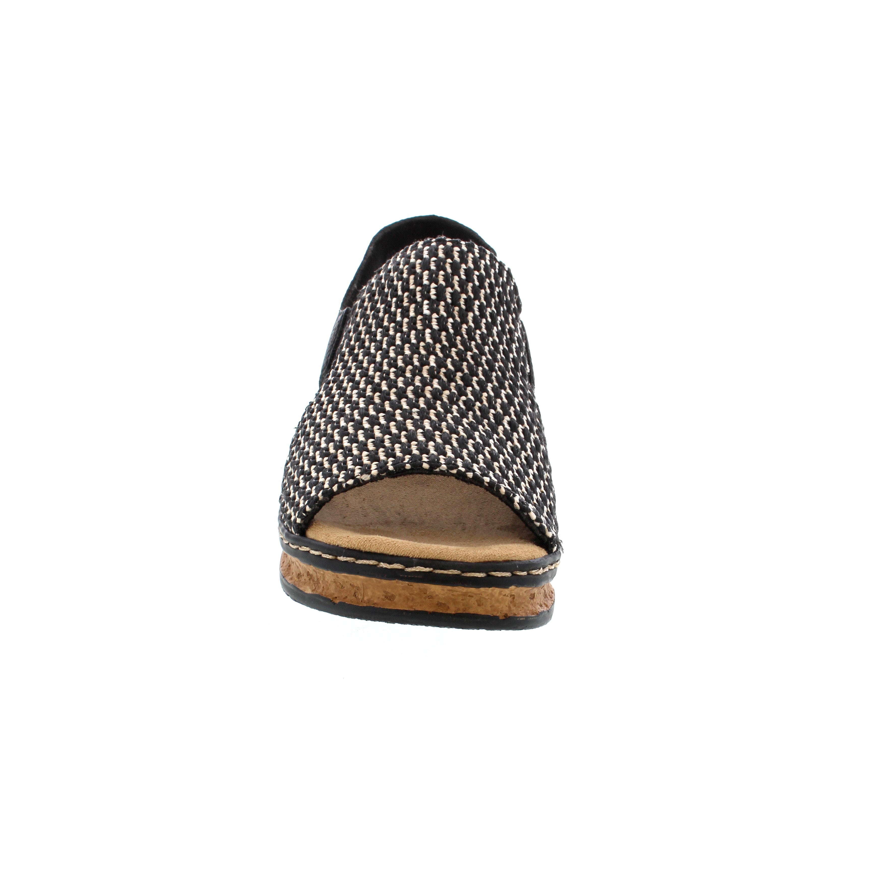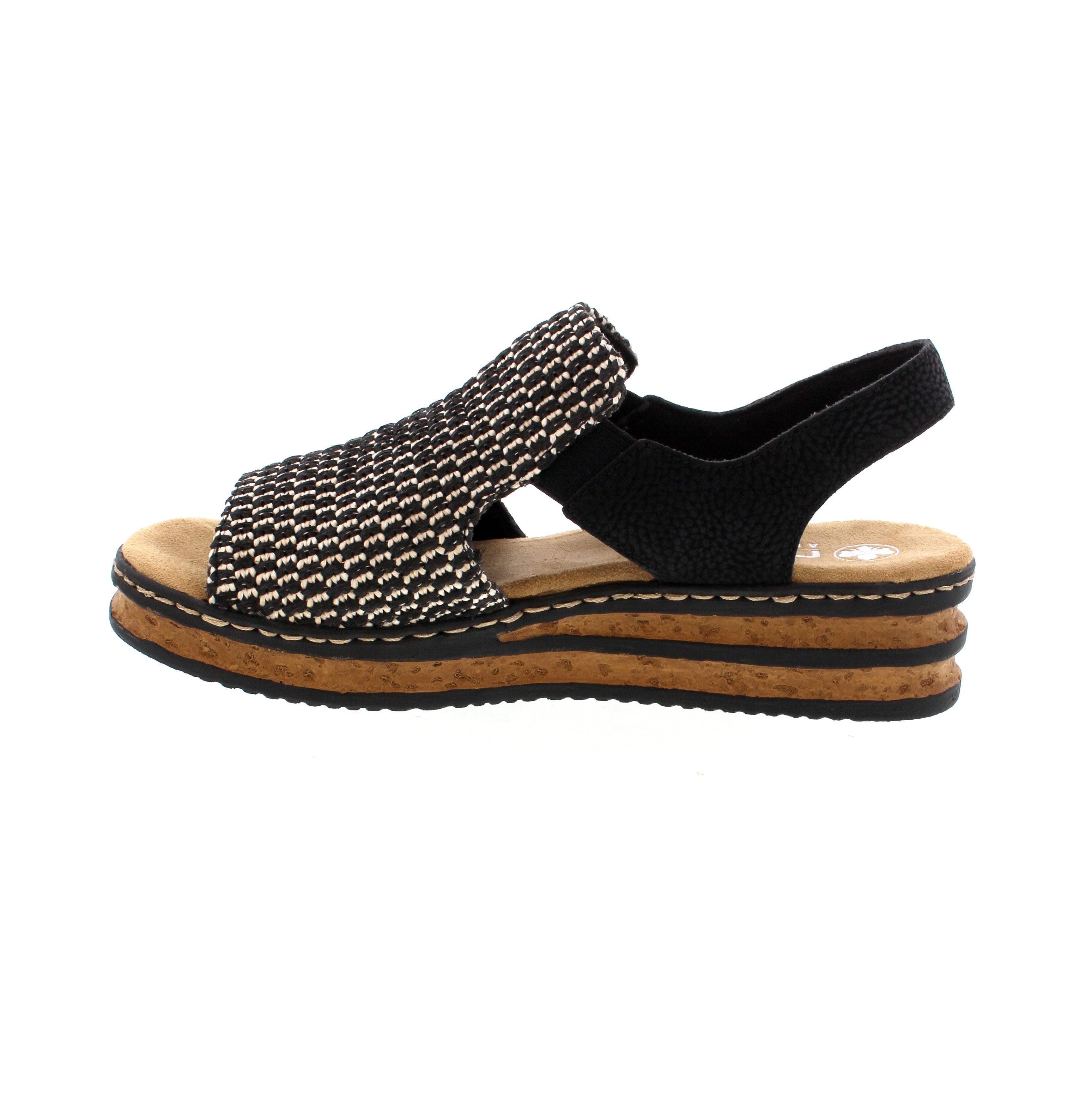 These black Rieker wedge sandals combine fashion and function. The stitchdown construction ensures durability and flexibility, while the elastic band simplifies putting on and taking off the shoe. The shock-absorbing, light sole and extra soft cover sole provide a comfortable walking experience.
