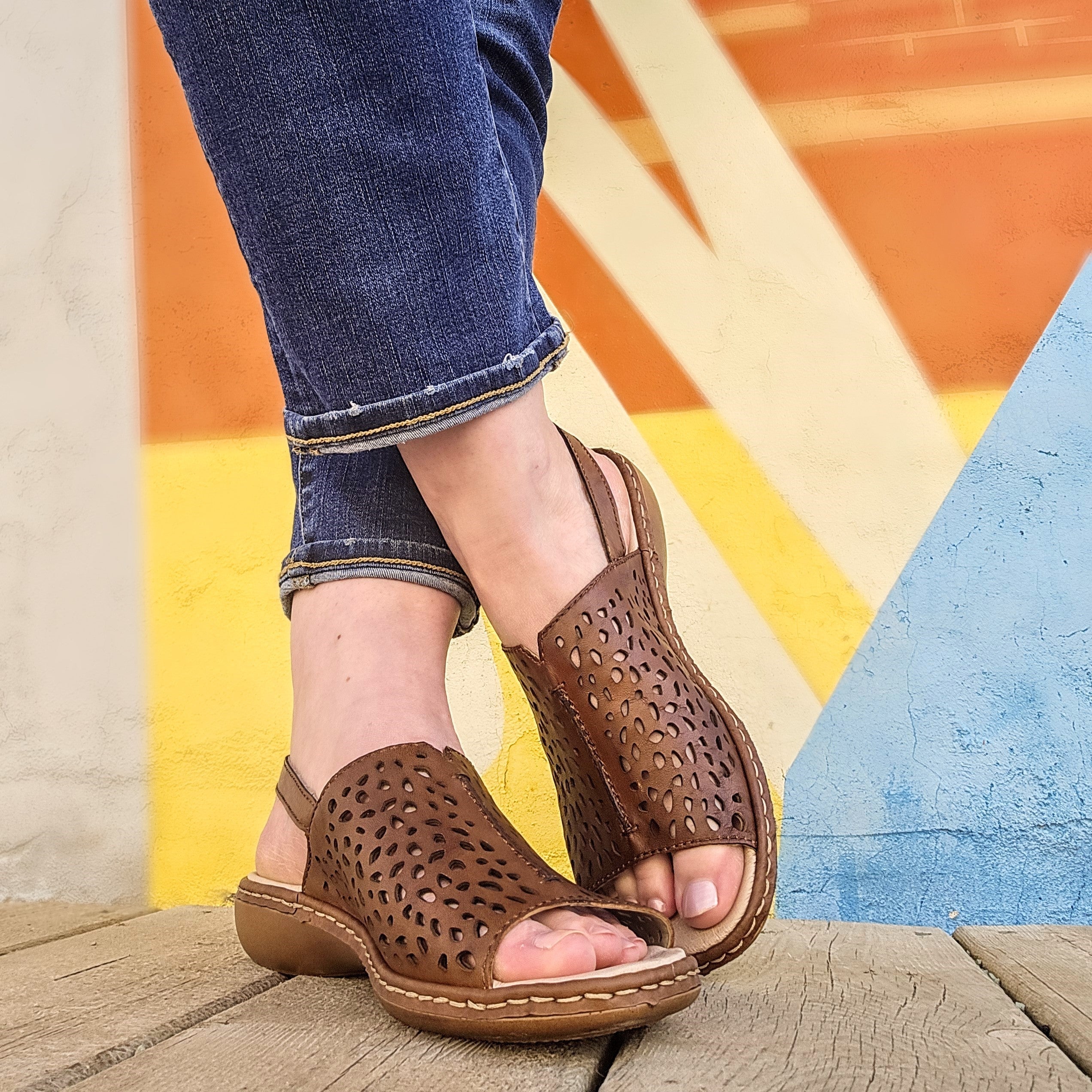Experience fashion and function with Rieker 65985-25 brown strap sandals. Made of smooth leather, these sandals boast a stitchdown construction for durability and flexibility. A hook and loop fastener allows for easy wear, while the shock-absorbing and light sole with wedge heel provides ultimate comfort. Enjoy the summer in style.