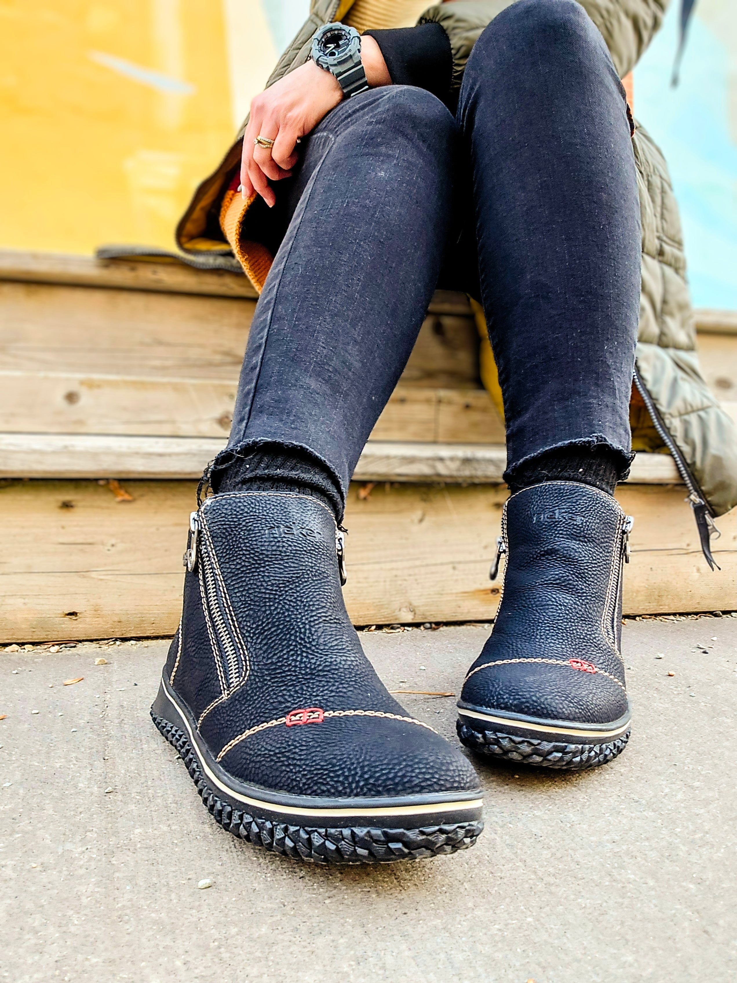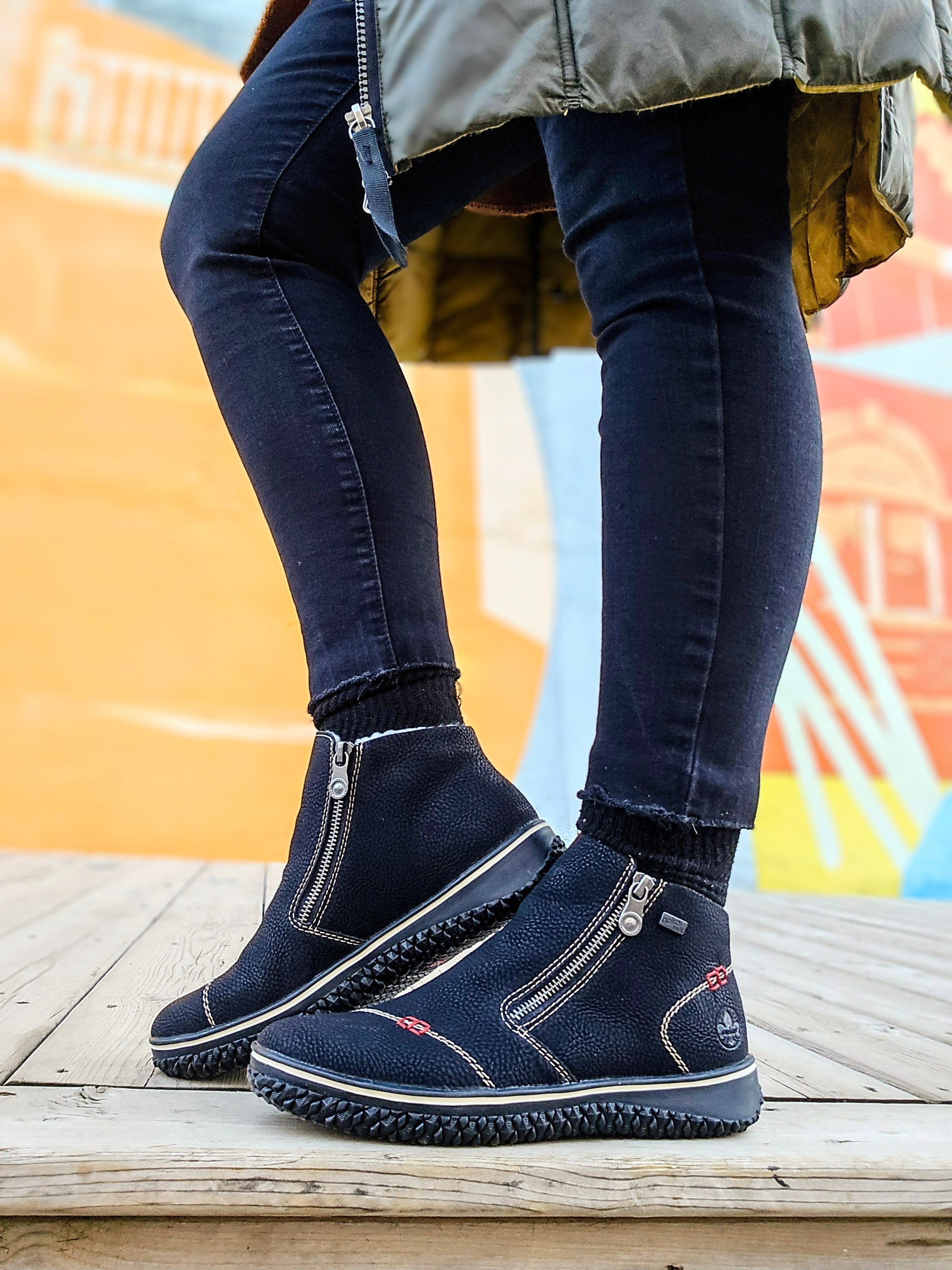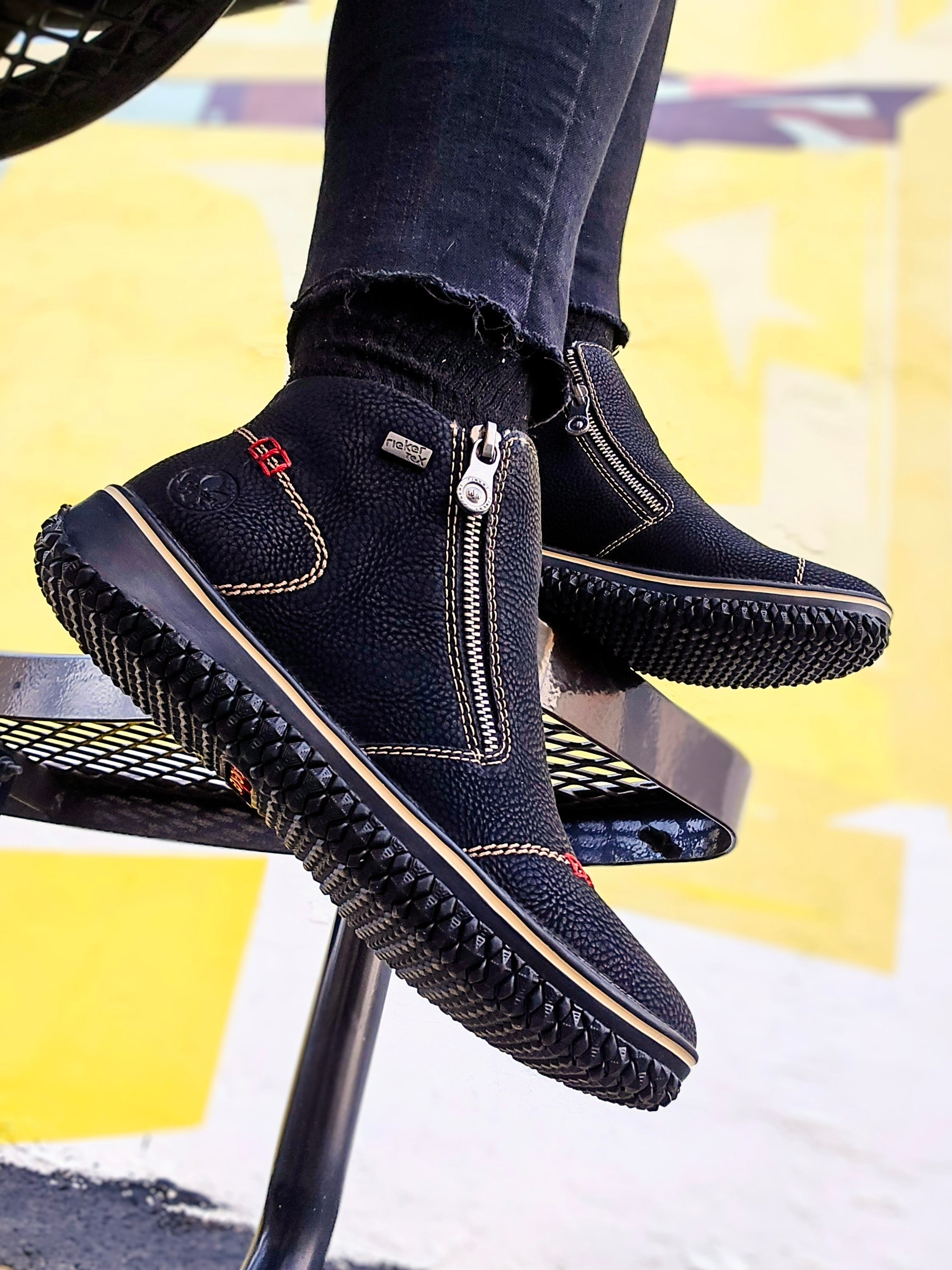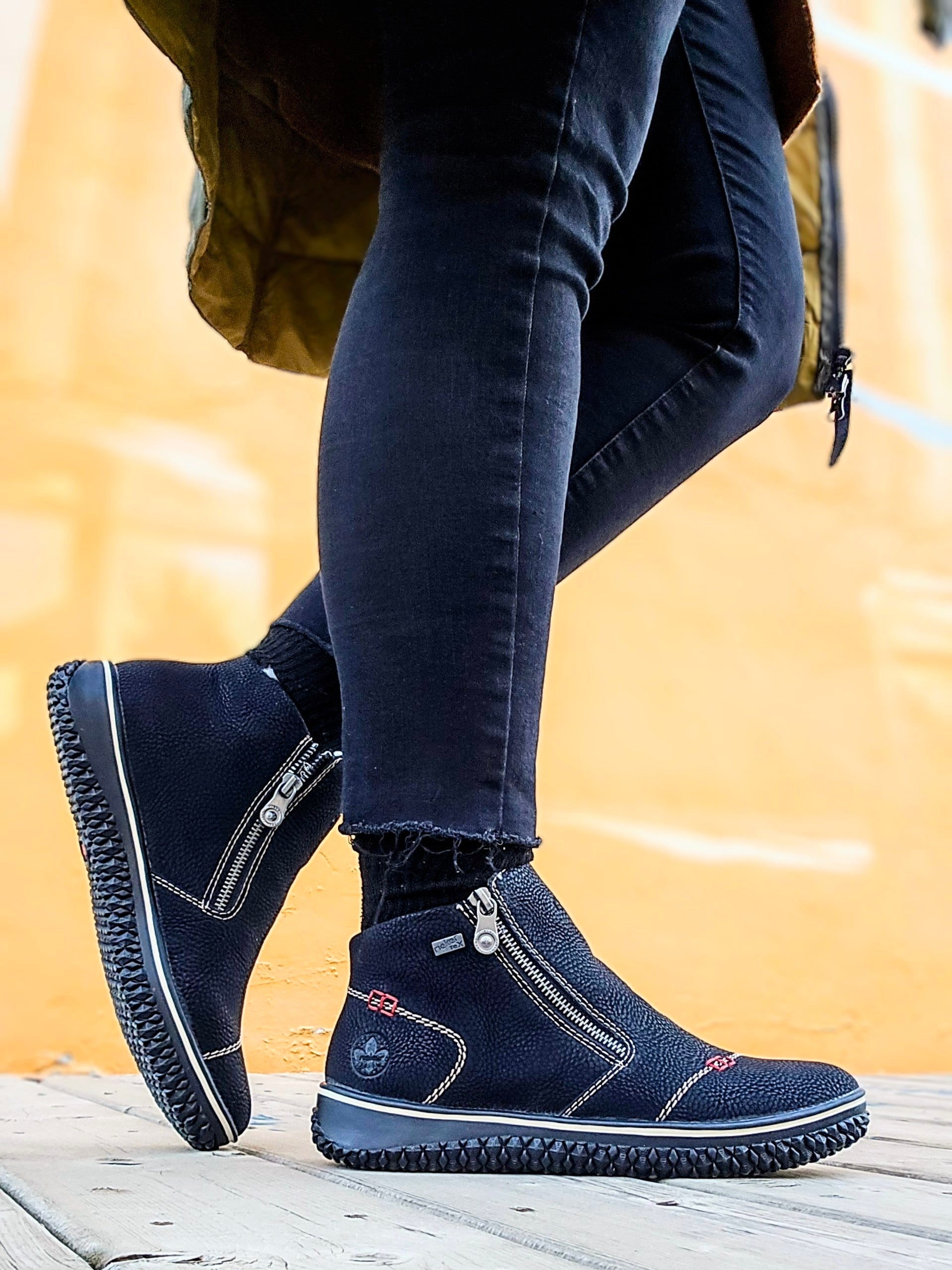The Rieker L4270-00 ankle boot is perfect for everyday wear. Designed with RiekerTex to repel water to keep your feet dry in the elements, this boot also features a side zipper for easy on/off, stitching detailing and a lugged sole for traction.