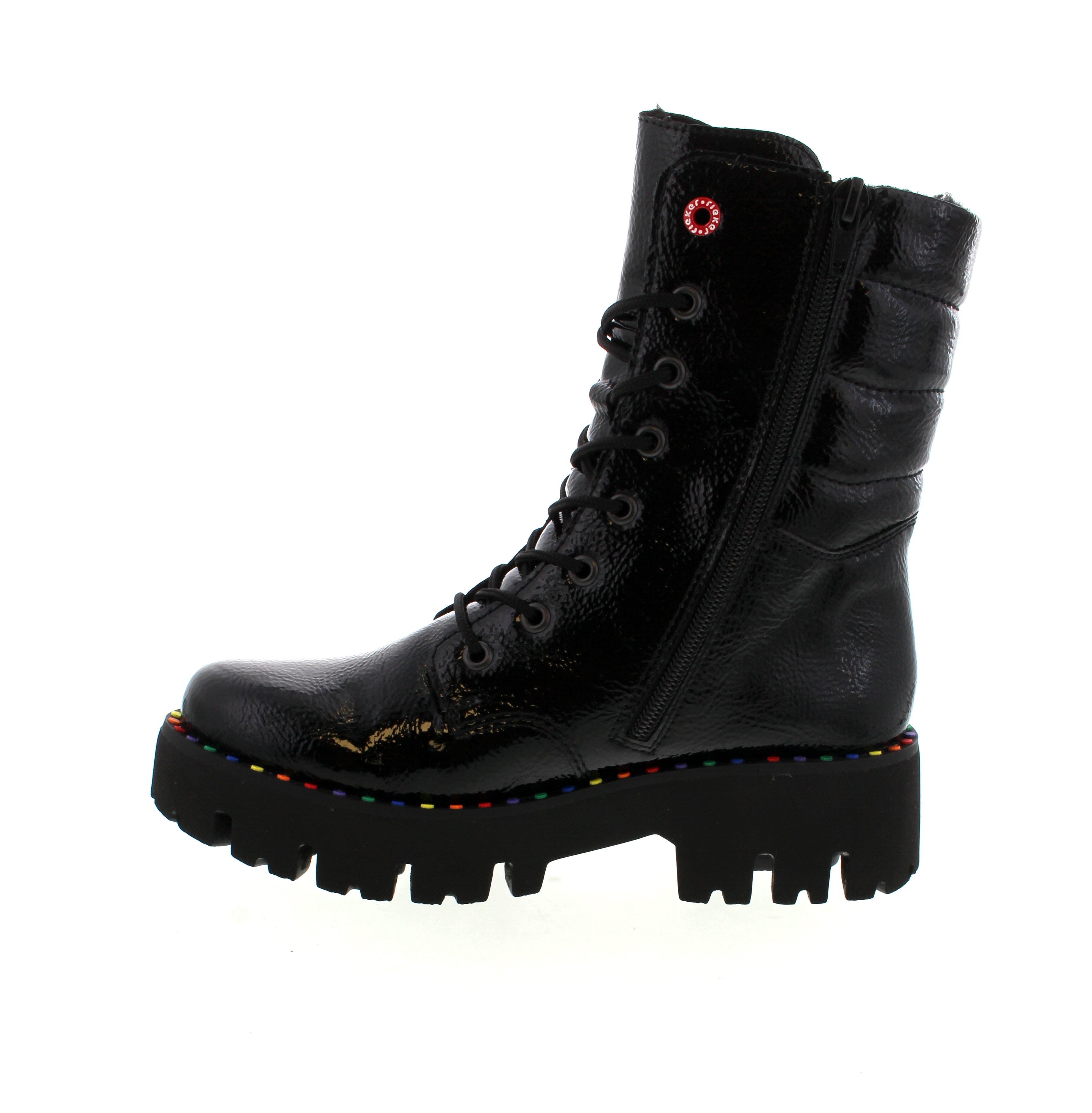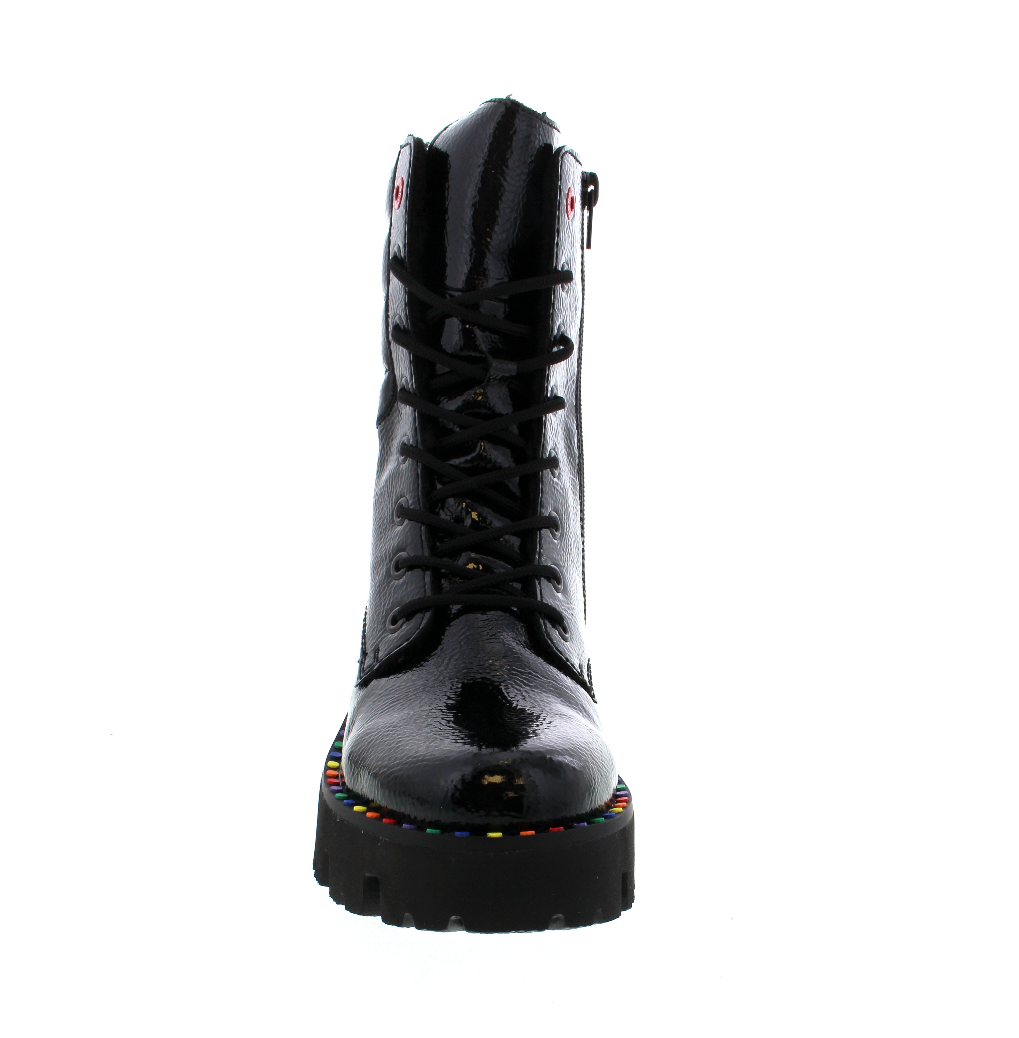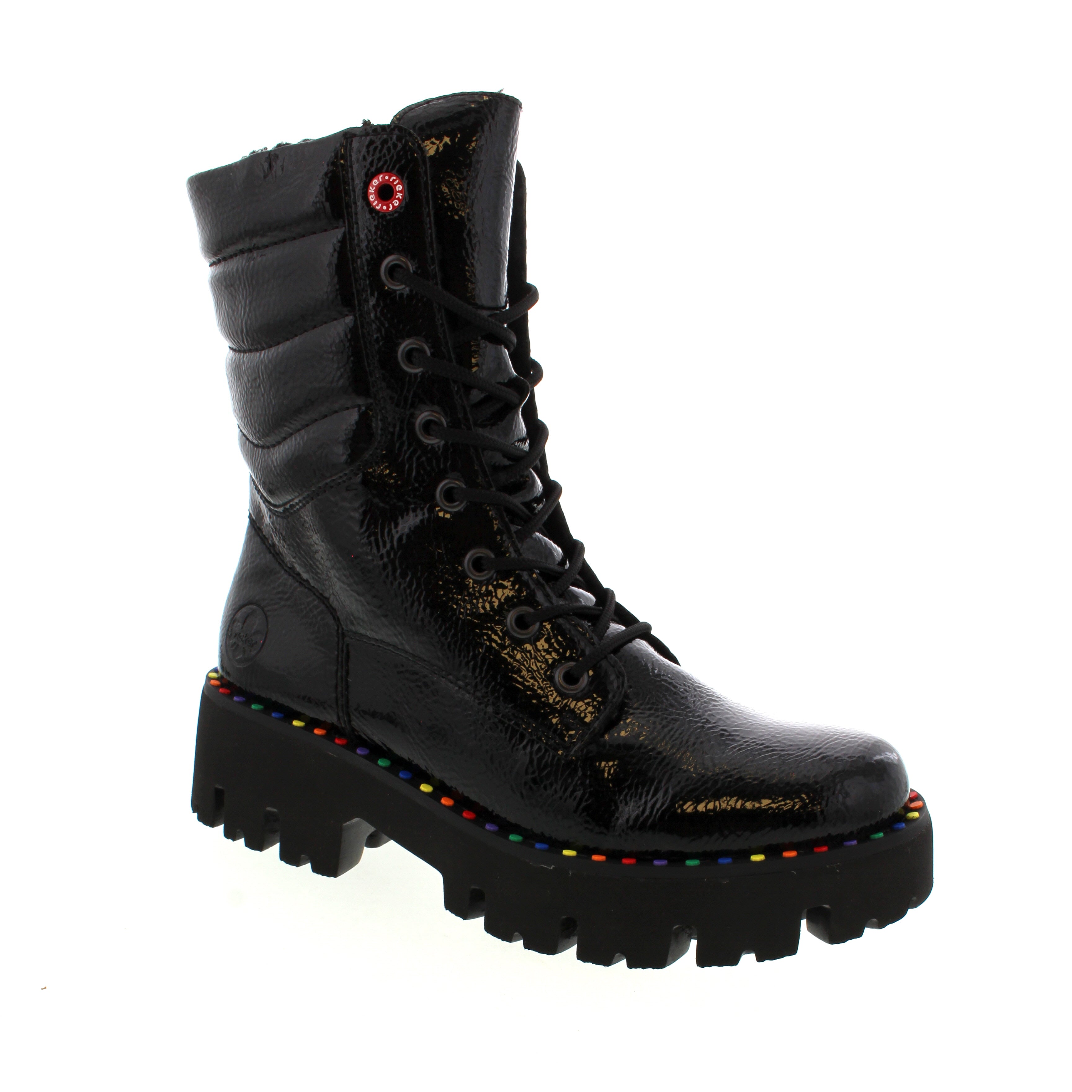 The Rieker Y3330-00 boot in Black features a polished patent leather upper paired with a practical lace-up design and side zipper for effortless on and off. Equipped with a removable insole, it ensures customizable comfort for extended wear. Engineered for casual and outdoor use, this boot delivers reliable support and a sleek look suitable for various settings.
