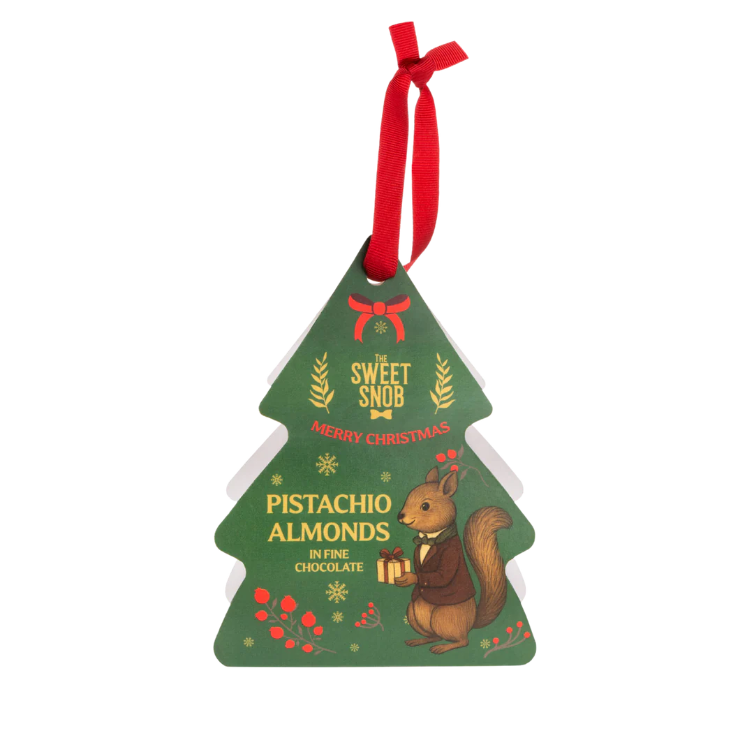 These delightful chocolates pair roasted almonds with a whisper of sea salt, all cloaked in velvety pistachio chocolate. In a Christmas tree-shaped box they are perfect for gifting to someone special.