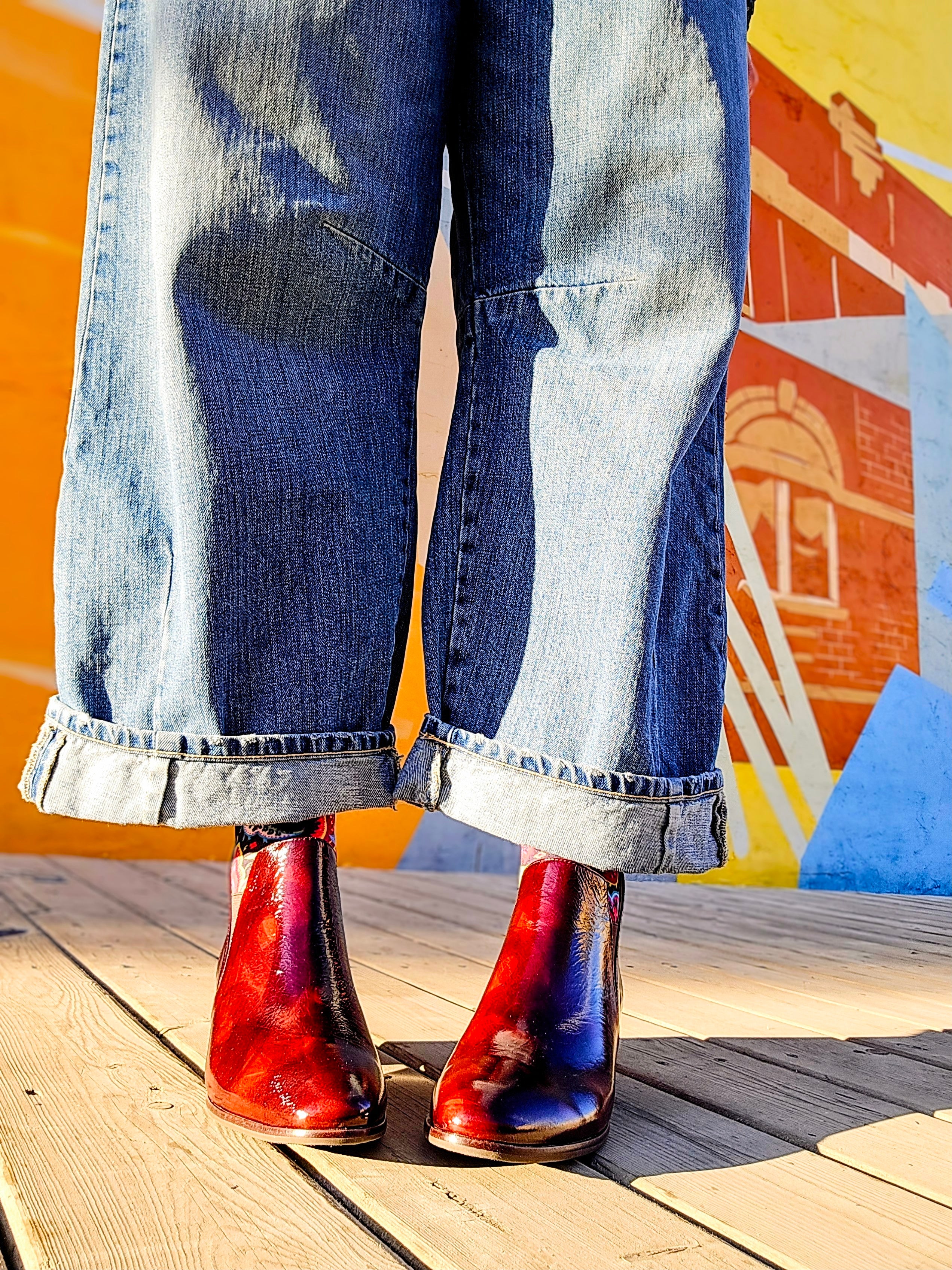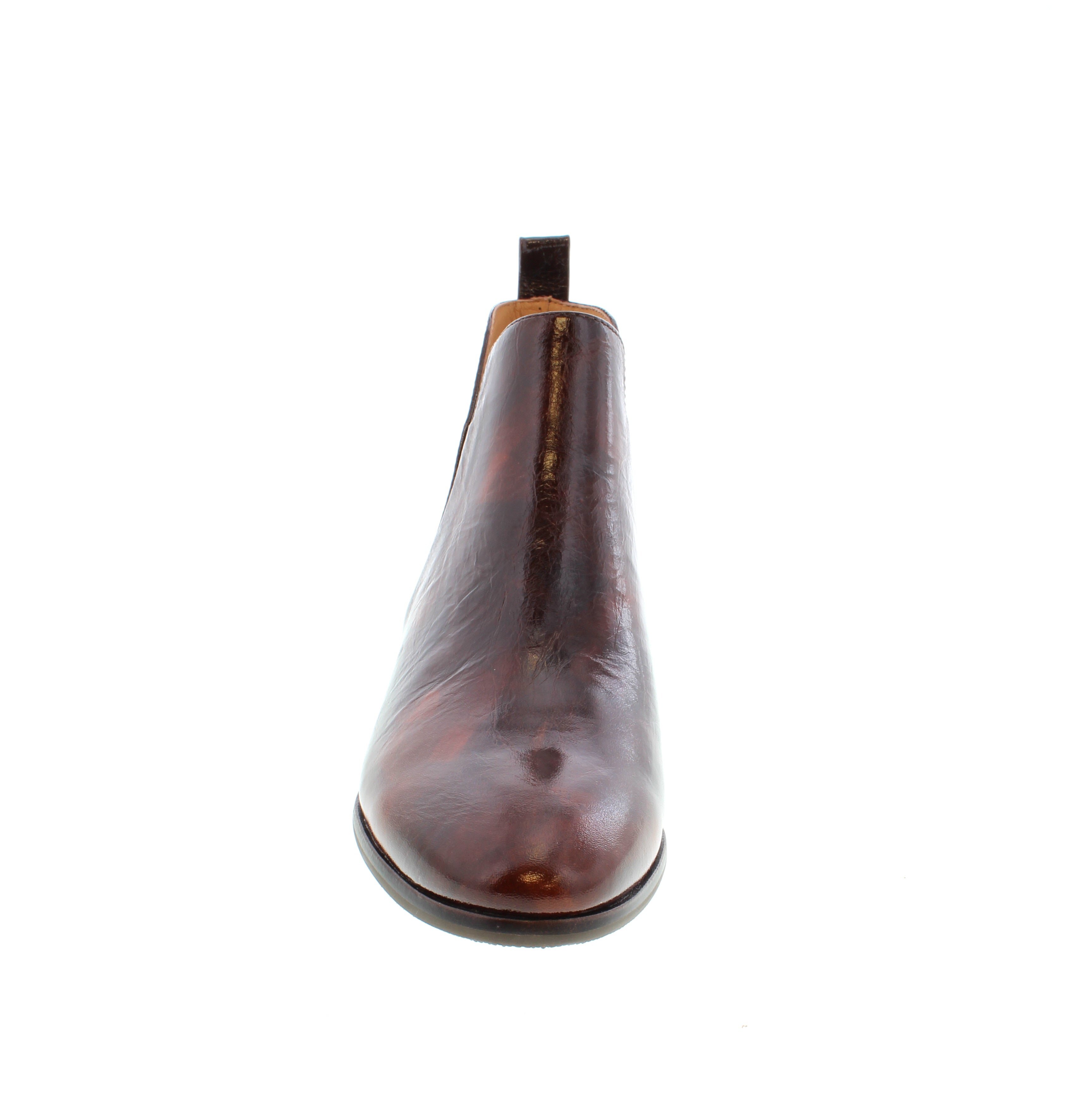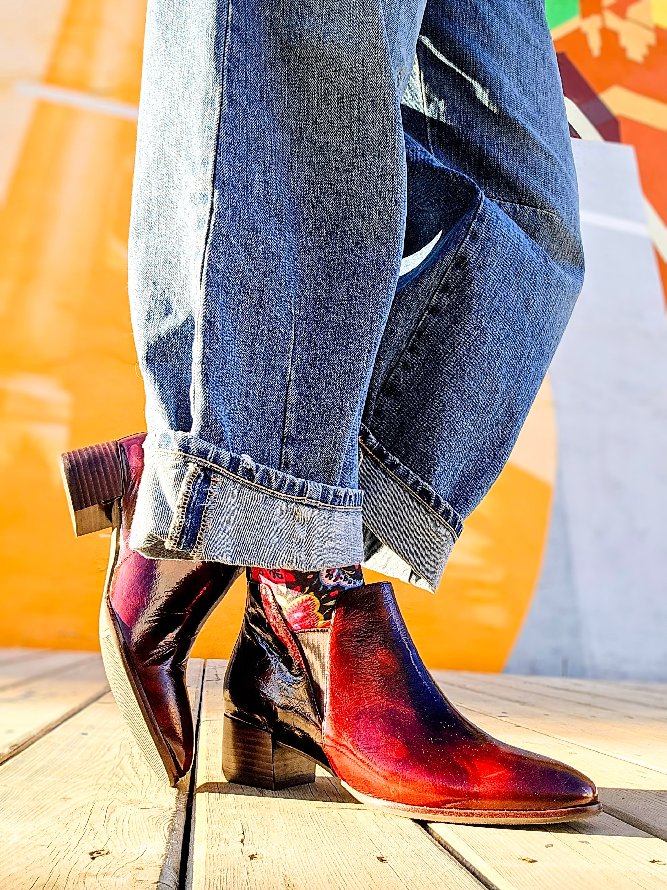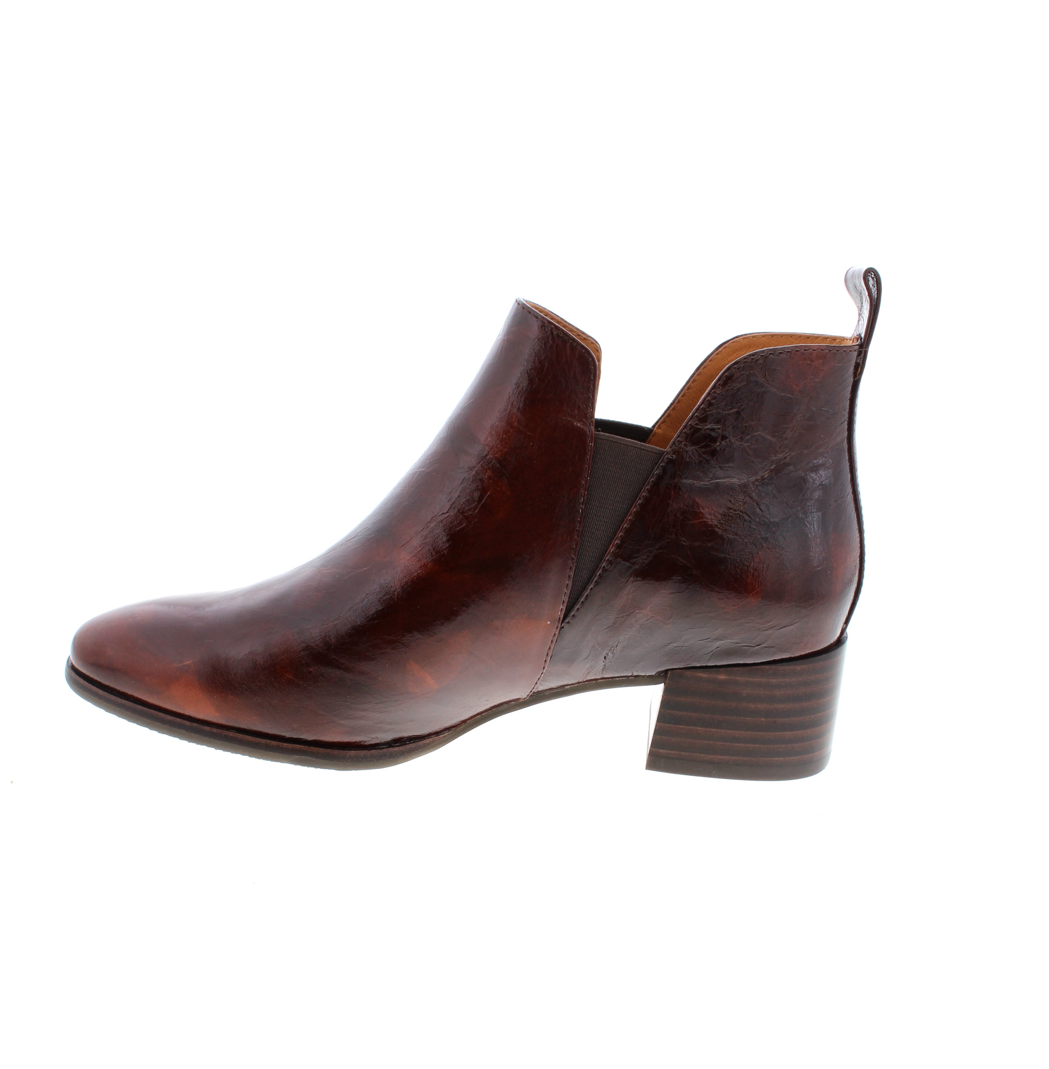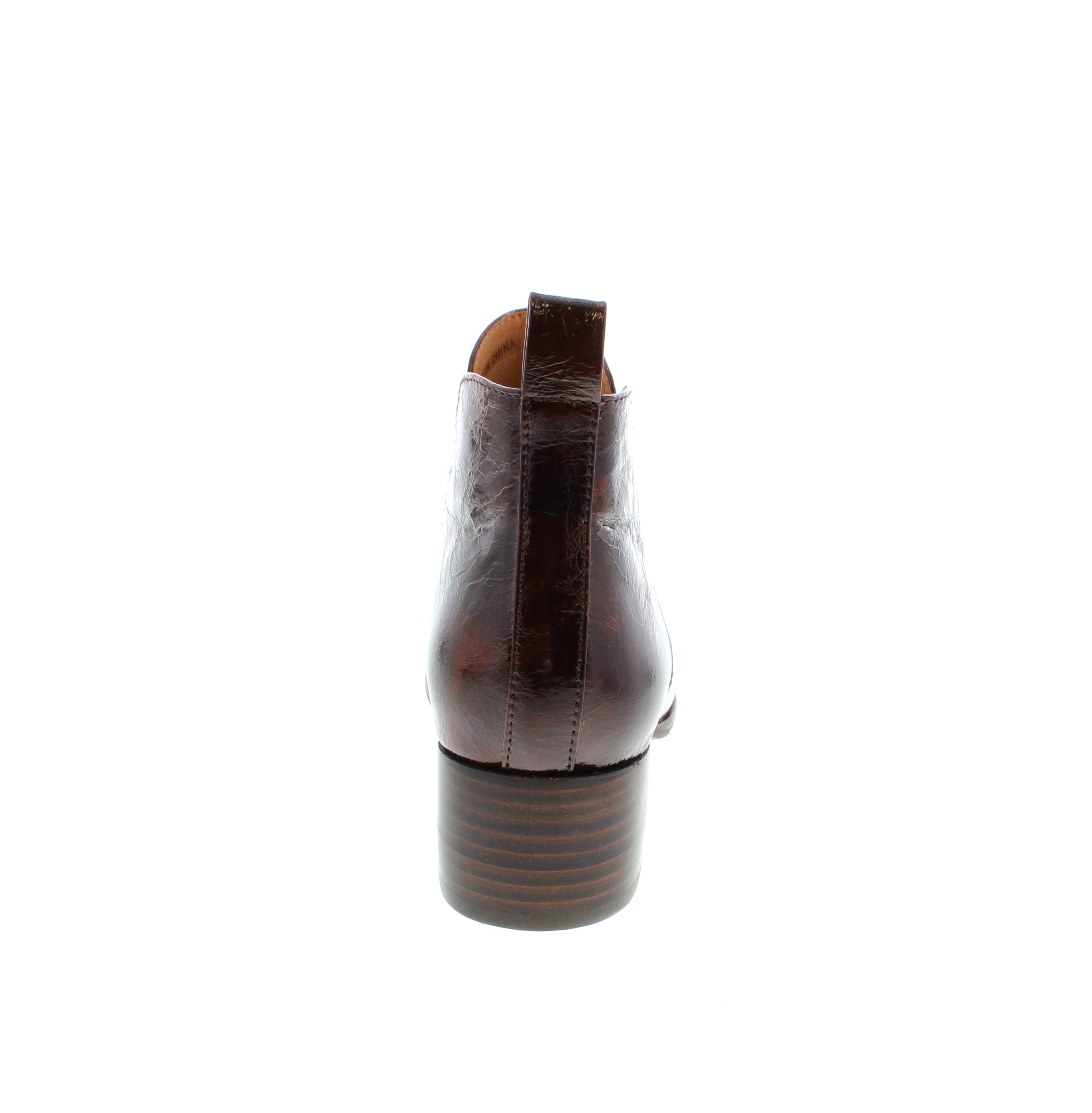 The Tamara London Anexia is a patent-leather ankle boot, featuring elastic gore panels for effortless on/off and a chunky heel for a touch of elegance.