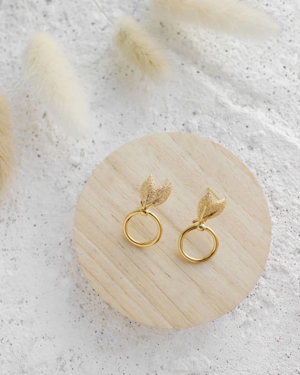 Experience the ultimate in luxury with Welldunn's Praline earrings. Make a statement with its 24 karat gold plated finish and delicate short studded design. Elegantly adorn your neck with the refreshingly unique design of its leave-shaped studs and tiny rings.